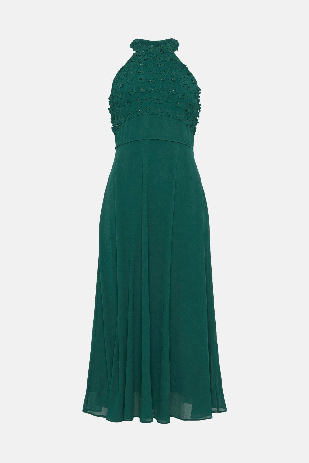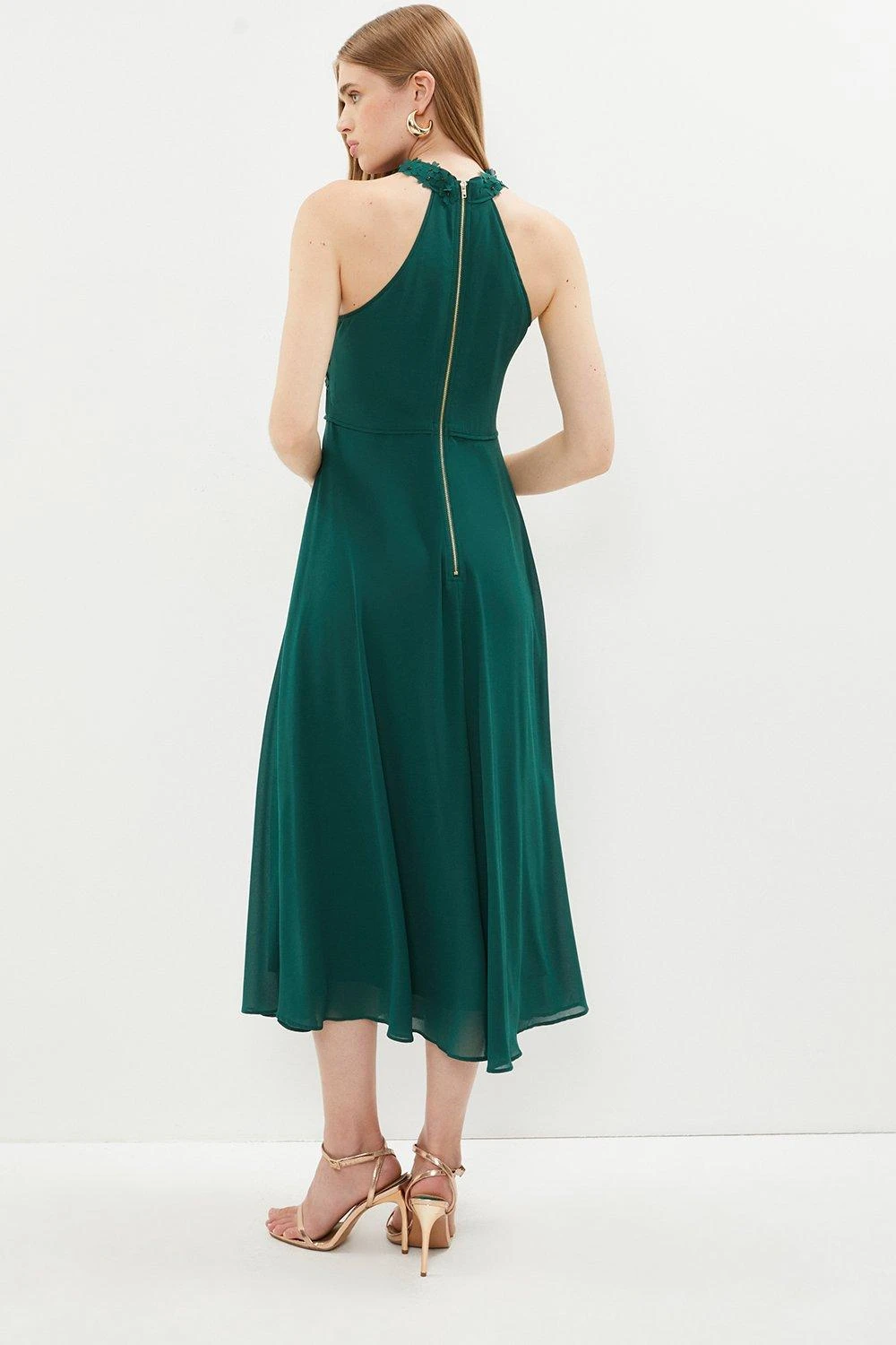 Three-dimensional rosettes provide an inspired touch on this beguiling midi dress. Finished with a feminine halter-neckline and flowing skirt, it exudes a sense of romance, fastening with an exposed zip closure that frames the back.