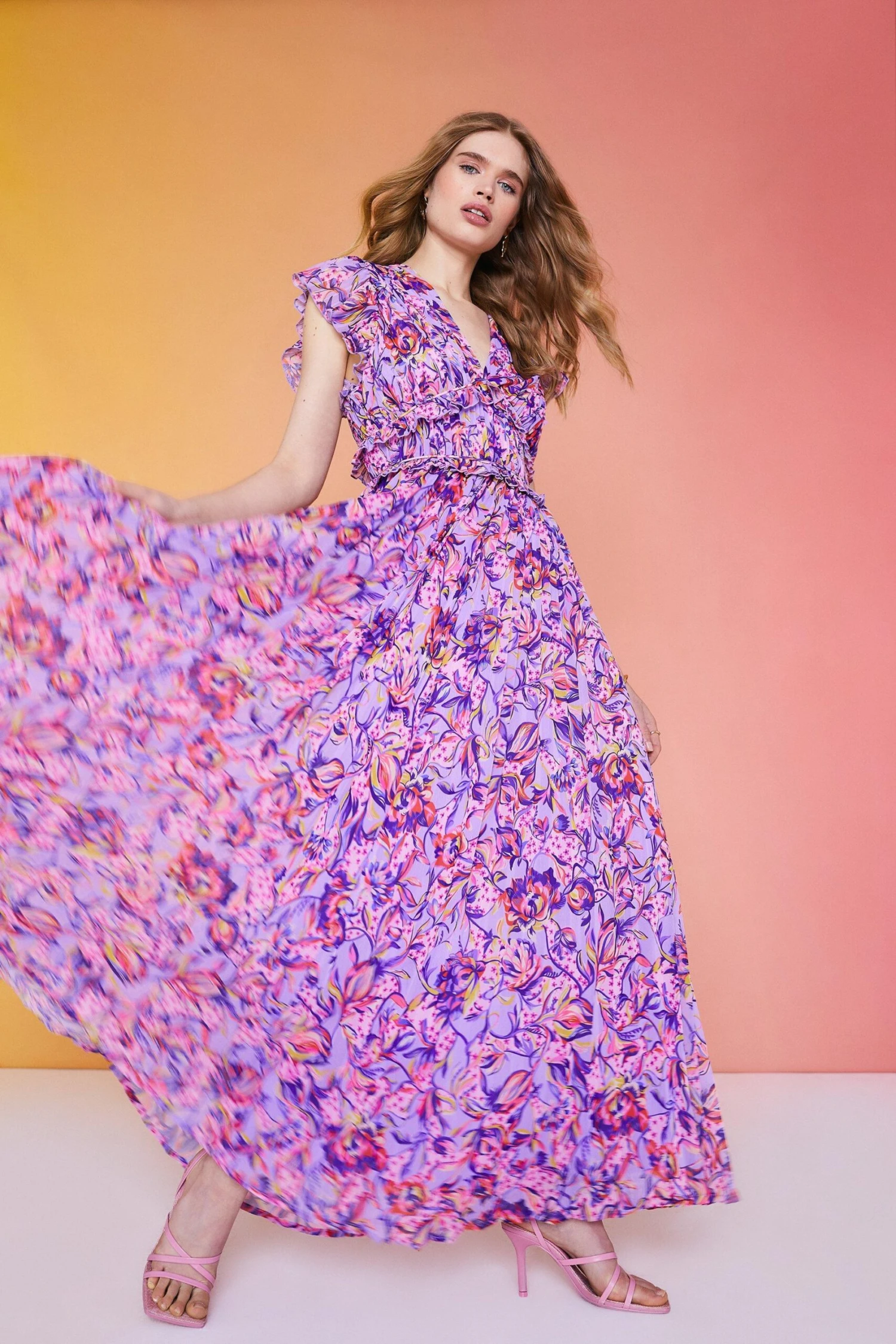 Offer excitement to your floral collection with this maxi dress. Vibrantly adorned with an all-over print, this piece is designed to utterly captivate wherever you go. Other show-stopping touches include a low V-neck front, open back, ruffled trims and a pleated full-length skirt.