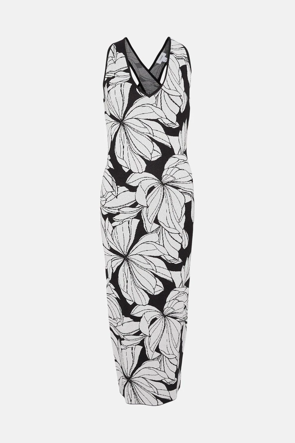 A modern way to wear monochrome, this bandage knit midi makes day-to-night styling a breeze. It features sporty crossover straps that frame the shoulders, along with a sensuous, streamlined silhouette that falls to just below the knee.