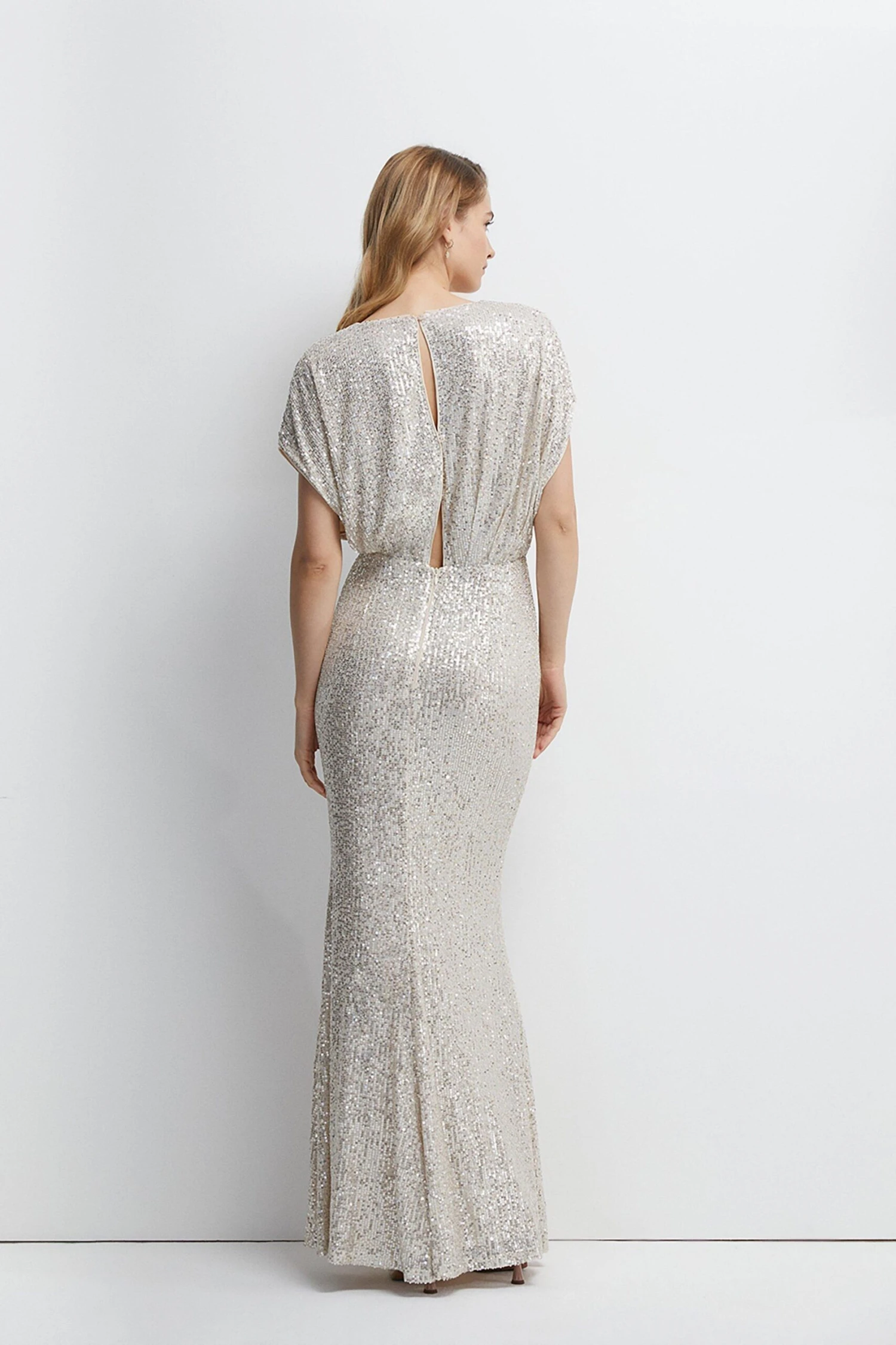 Main: 90% Polyester, 10% Elastane. Tim: Sequin. Lining: 100% Polyester. Dry clean only. Length: 158cm