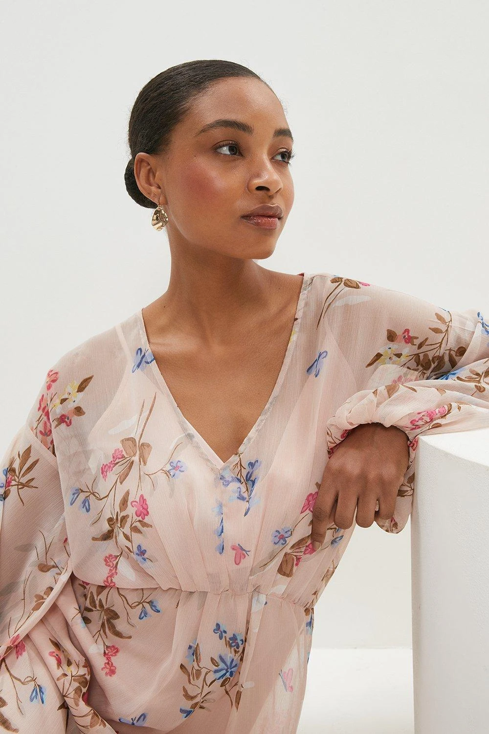 Perfect summertime adventures with this dress. The ultimate length, the midmaxi, the piece beautifully flares into an ankle-skimming skirt. Florals offer a romantic touch, alongside billowing sleeves and gentle pleats.