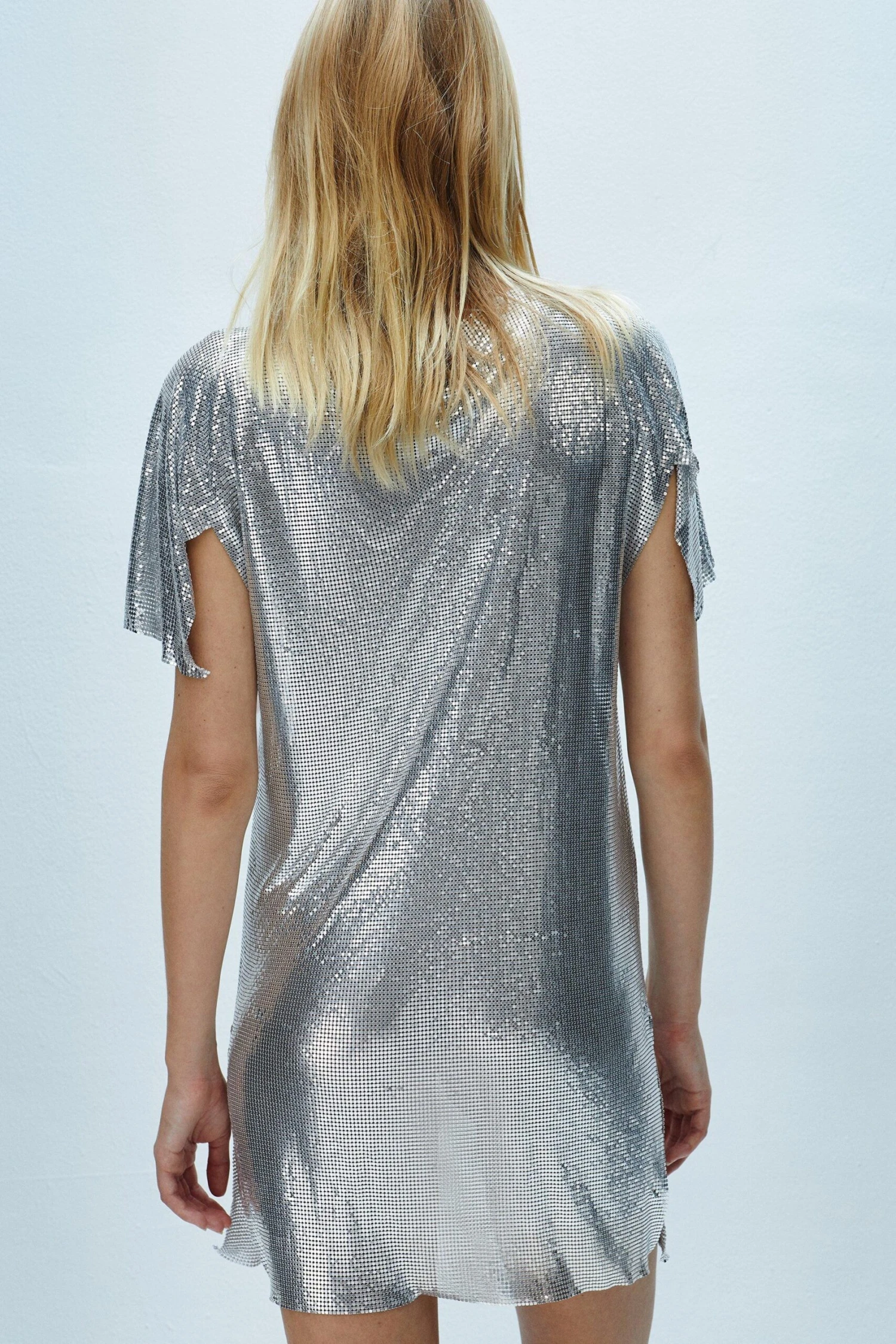 Channel the glimmer of a disco ball with this chainmail mini dress. The perfect piece to take to the dancefloor, the slinky fabric skims the figure and ripples dramatically with every step. Softly draped sleeves add a feminine touch to this dazzling piece.