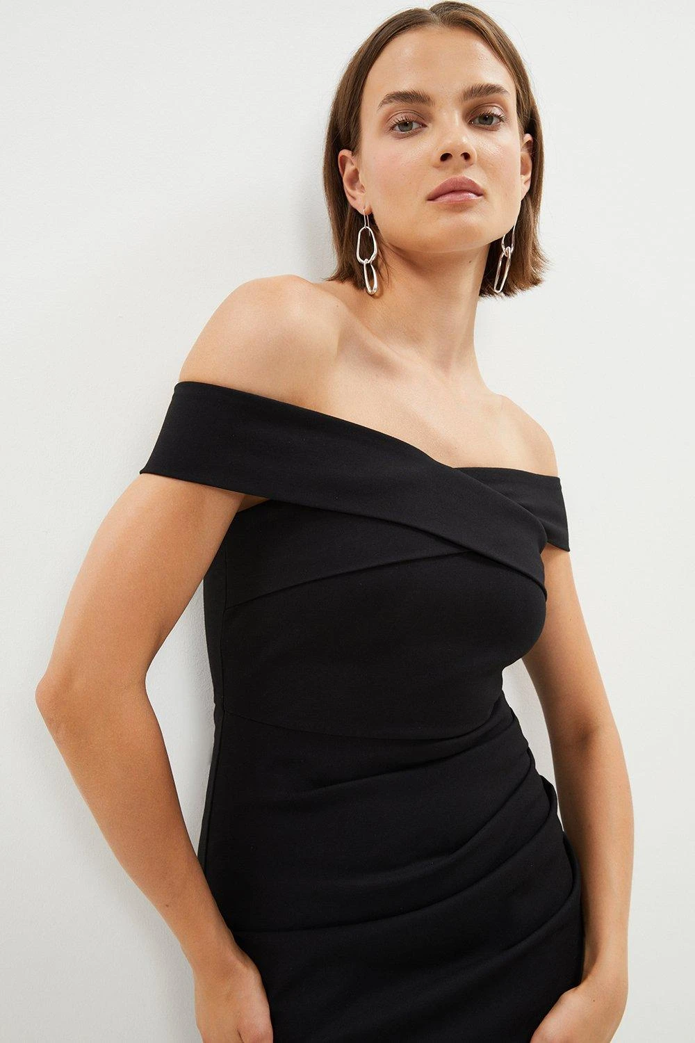 Designed to sculpt the form to streamlined perfection, this bandage-style pencil dress exudes easy glamour. The bodice features a wrap-over Bardot neckline to exposed polished shoulders, whilst the skirt comes complete with a seductive split to show a hint of skin as you stride. Zipped at the back, it slips on with elegant ease.