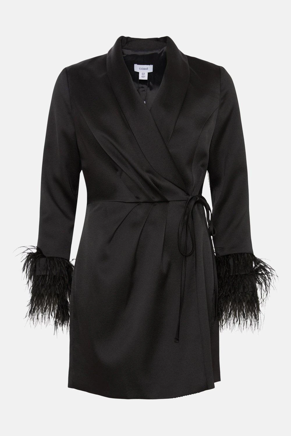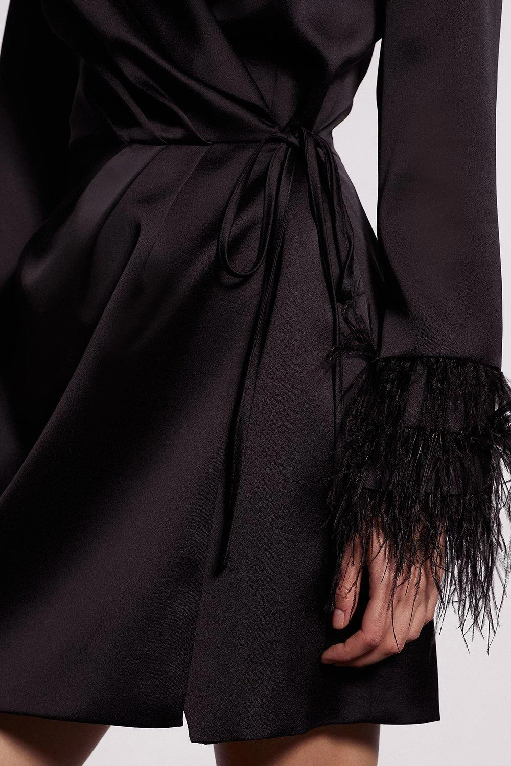 Main: 100% polyester Lining: 100% polyester Trim: Feathers. Dry Clean only. Length: 90cm