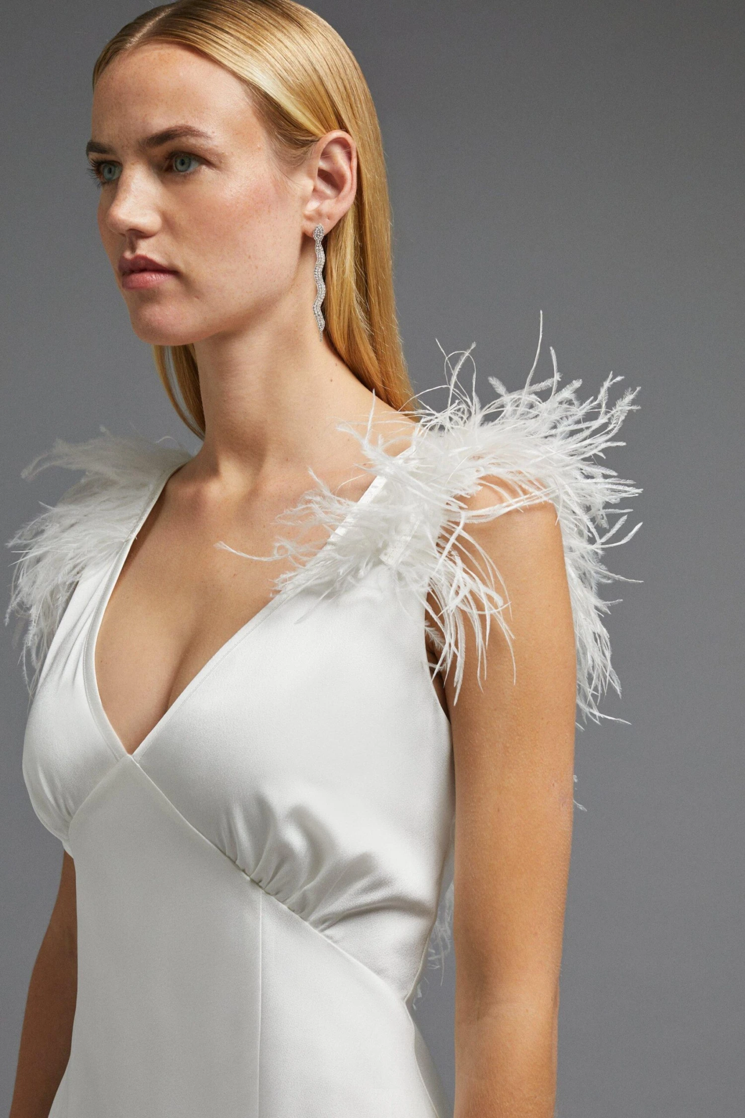 Tufts of ethereal ivory feathers adorn the shoulders and back of this striking bridal gown for a whimsical, fairytale-inspired feel. It features a plunging V-neck bodice to accentuate your bust, balancing out the flowing fishtail skirt and elegant V-cut back. Counter the charming feathered trims with understated accessories.
