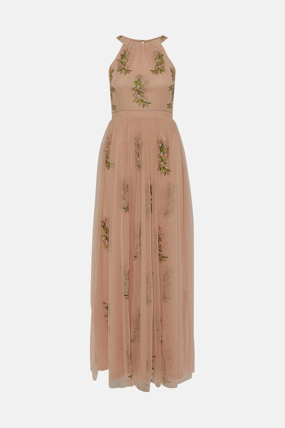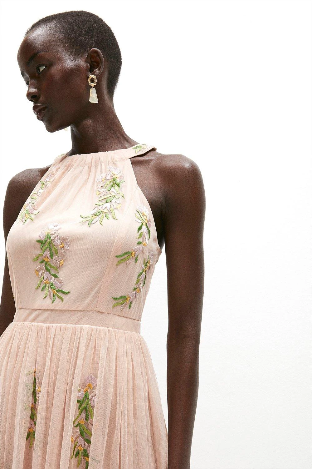 Find beauty in simplicity with this halterneck maxi dress. Completed with delicate floral embroidery, fitted bodice and dreamy tulle skirt, it is the ideal choice for a wedding guest look. Pair it with statement earrings for extra sophistication.