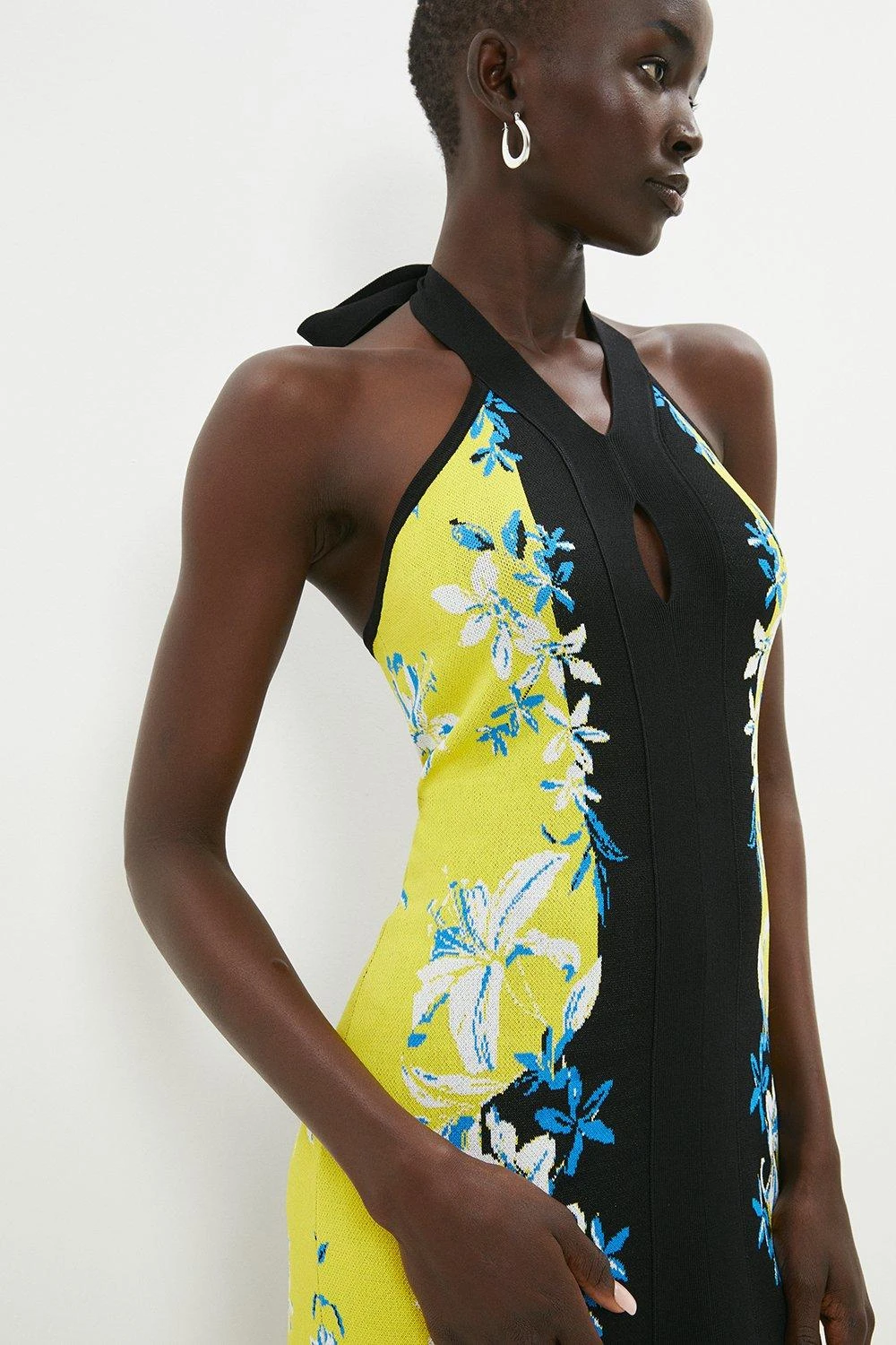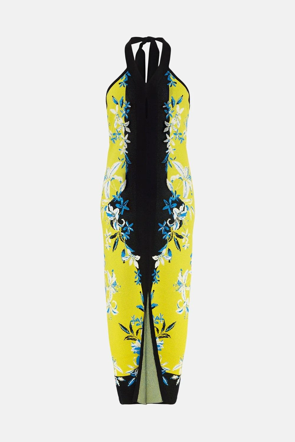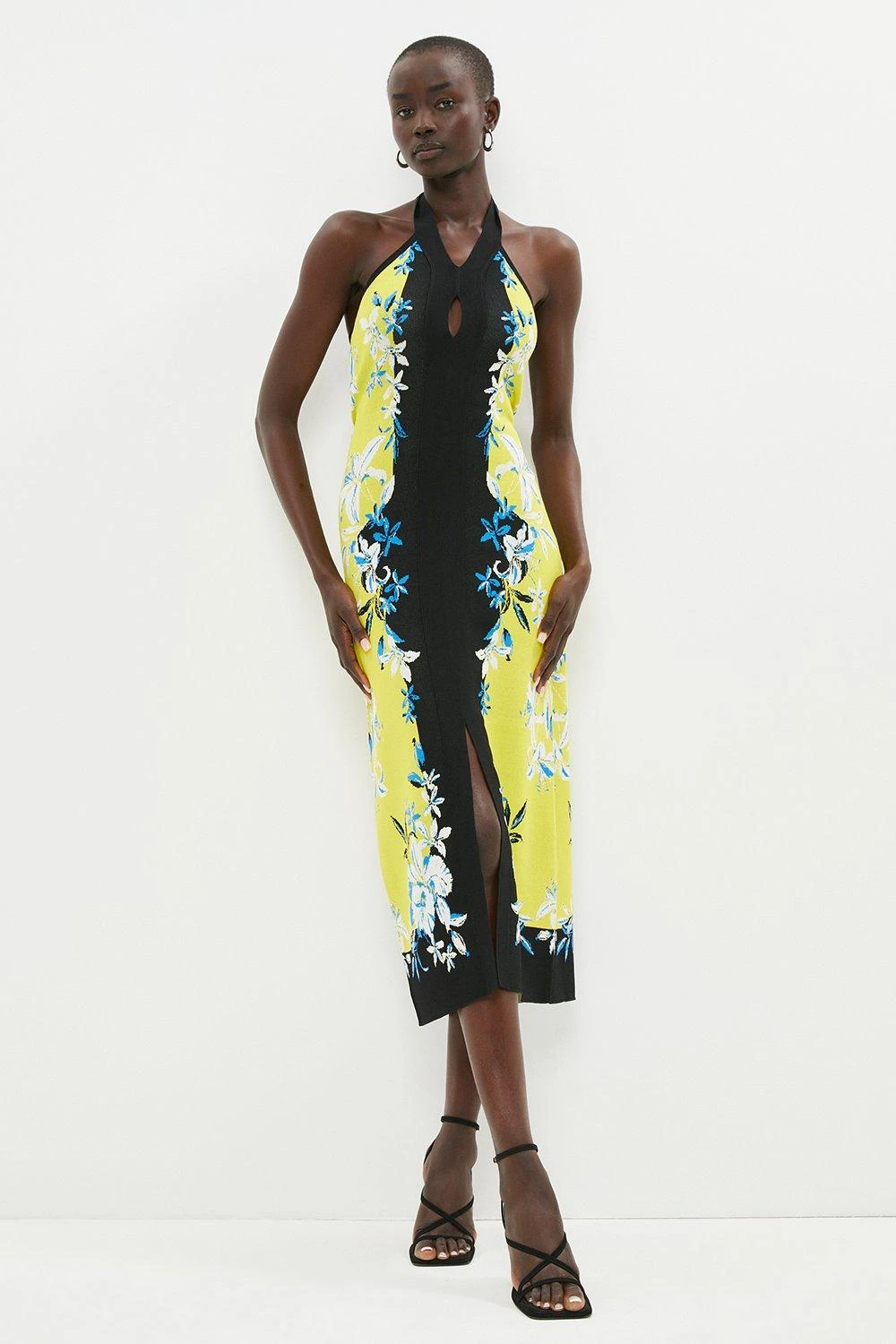 Slinky by name and by nature, this form-fitting knit midi dress combines a striking floral print with colour-block panels and a feminine halter neckline. Sculpting the figure seamlessly, it features a front hem split to show a sliver of skin as you step.