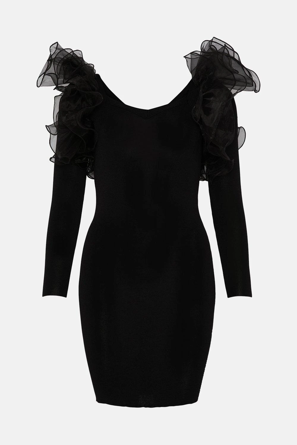 Made for those who like to stand out, this statement mini dress takes inspiration from the art of ‘80s power dressing. Opulent organza frills frame each shoulder, adding a voluminous twist to the streamlined silhouette. Add glimmering jewels and spike-heel stilettos for an arresting after-dark ensemble.