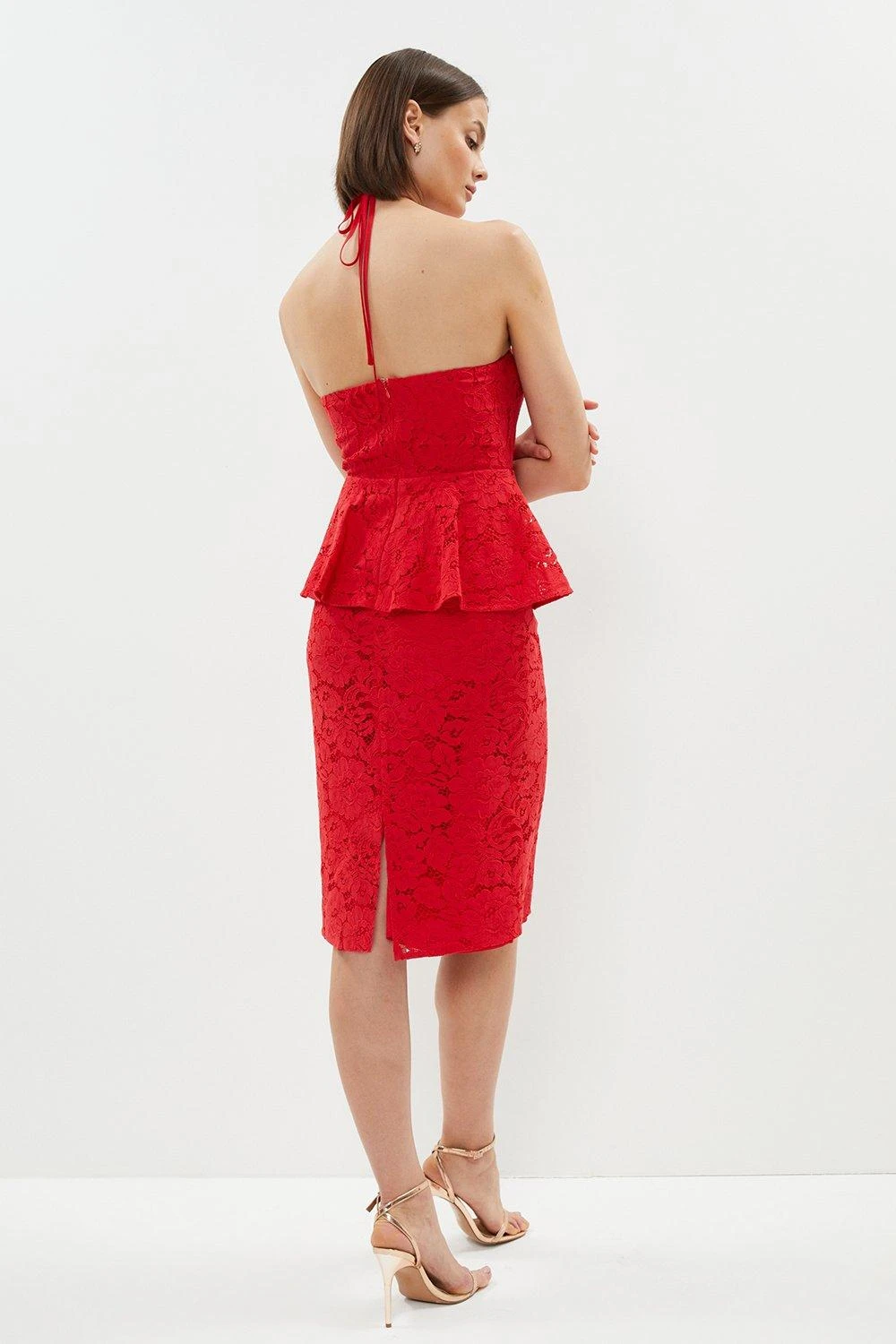Exquisitely enveloping the form, this lace pencil dress combines a flirtatious peplum waistline with slim halter-neck straps that tie at the back of the neck. The sleek pencil skirt hugs curves beautifully to guarantee a leg-lengthening finish – just add heels.