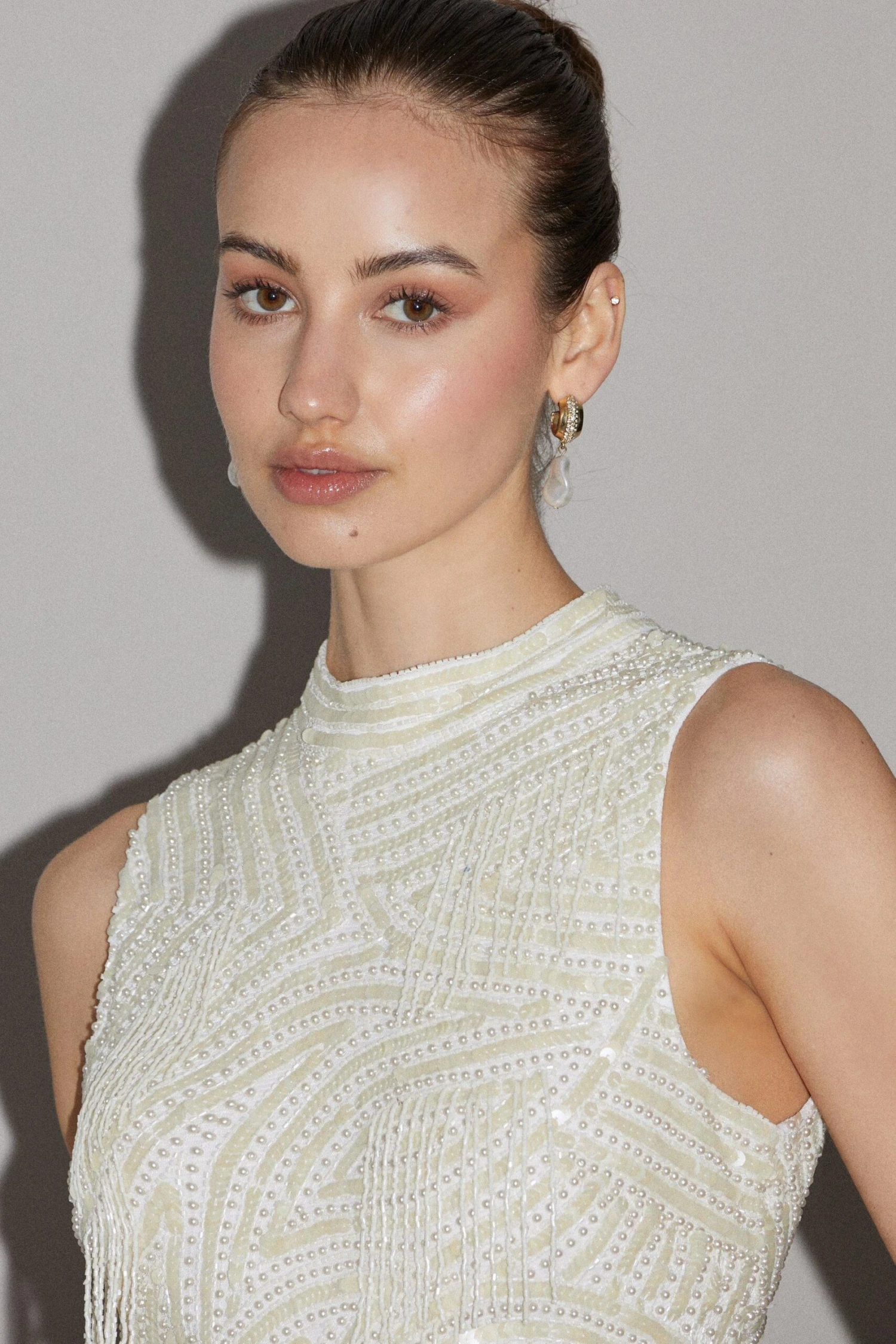 Part of the Sophie Habboo x Coast collection. Embracing an art-deco aesthetic, this mini dress echoes Sophie’s penchant for elevated simplicity. Featuring a body contouring silhouette with an open back, this design is fully adorned with beautiful fringed embroidery.