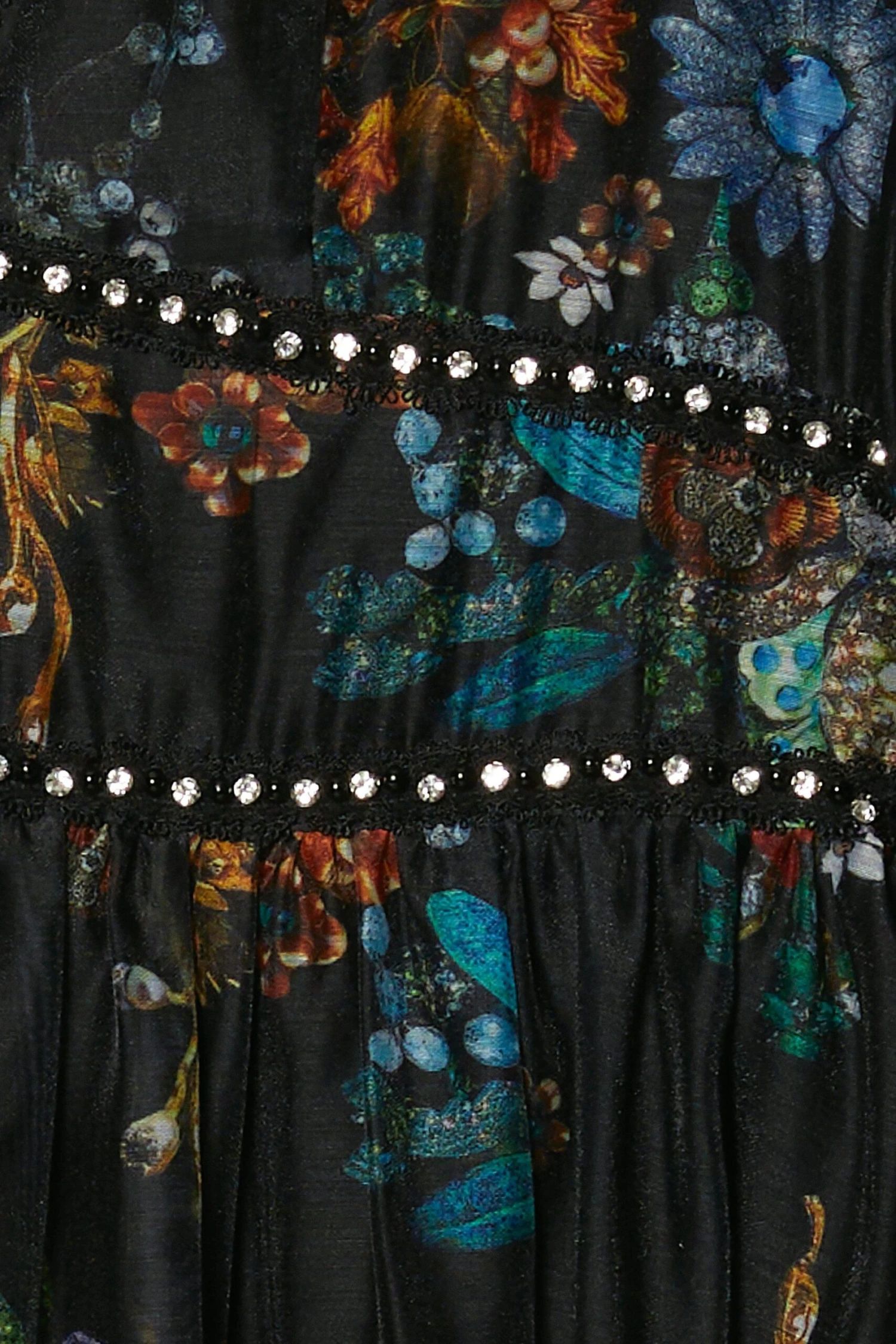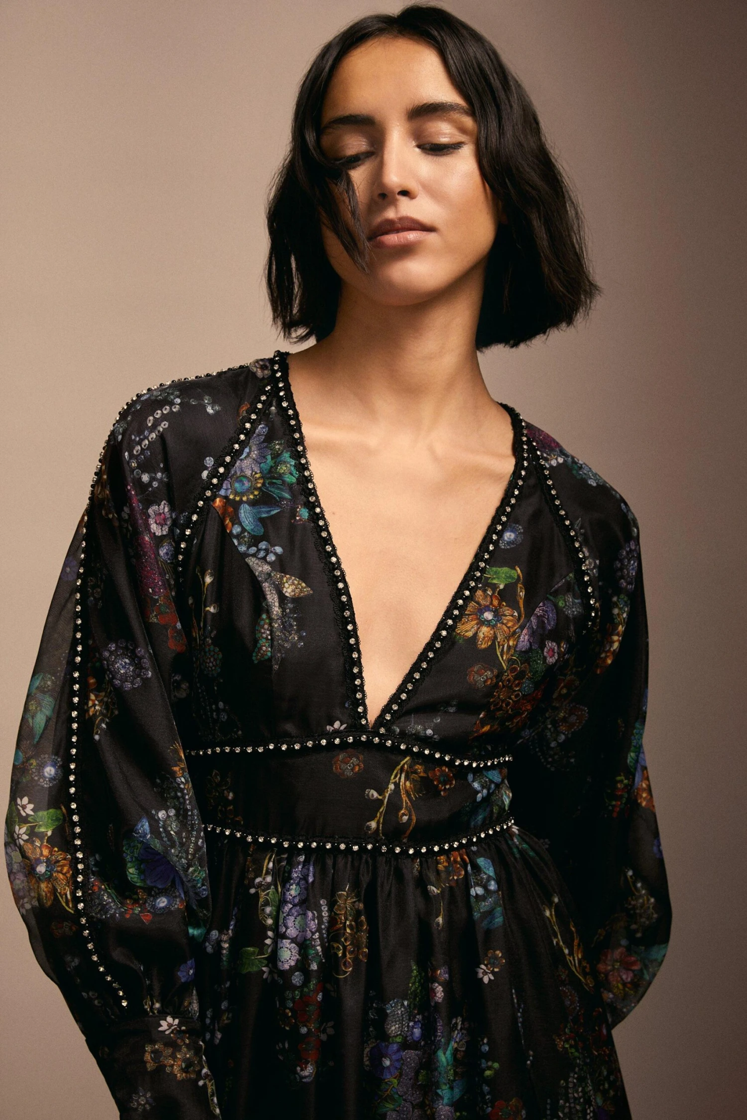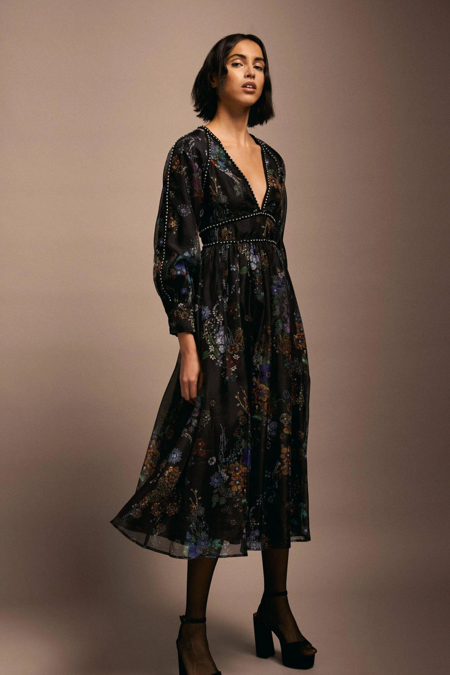 Accented with gleaming diamante studs across the bodice and sleeves, this midi dress is effortlessly elegant. Crafted with organza mesh material, the balloon sleeves and skirt flare out to create a flattering silhouette, while autumnal floral details add a feminine touch and complement the inky black hue. Style this dress with tights and chunky boots for an easy day-to-night look.