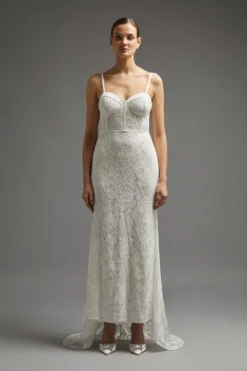 Whether worn to underpin a gauzy embellished cape or styled alone for a dramatic twist, this elegant maxi dress feels perfect for your special day. It shows off a sculpting bustier with moulded cups, and a sweeping maxi skirt that pools elegantly at the floor for a satisfying sweep as you stride up the aisle.