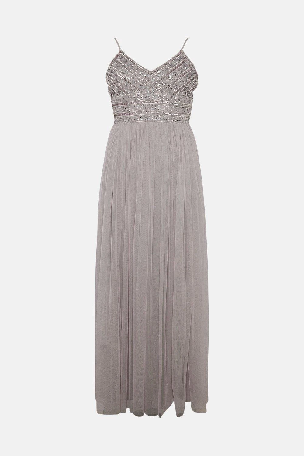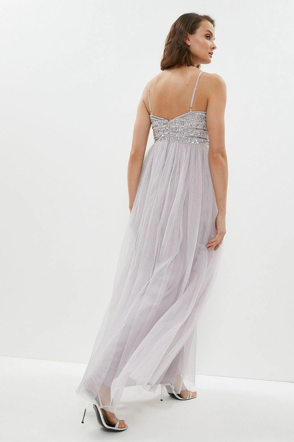 Embrace your romantic side in this flowing tulle maxi dress. Marrying an intricately embellished cami bodice with a gauzy tulle skirt, it makes a gorgeous impression on blooming bridesmaids or at Black Tie balls. The slender straps and open back show off sun-kissed shoulders to perfection.