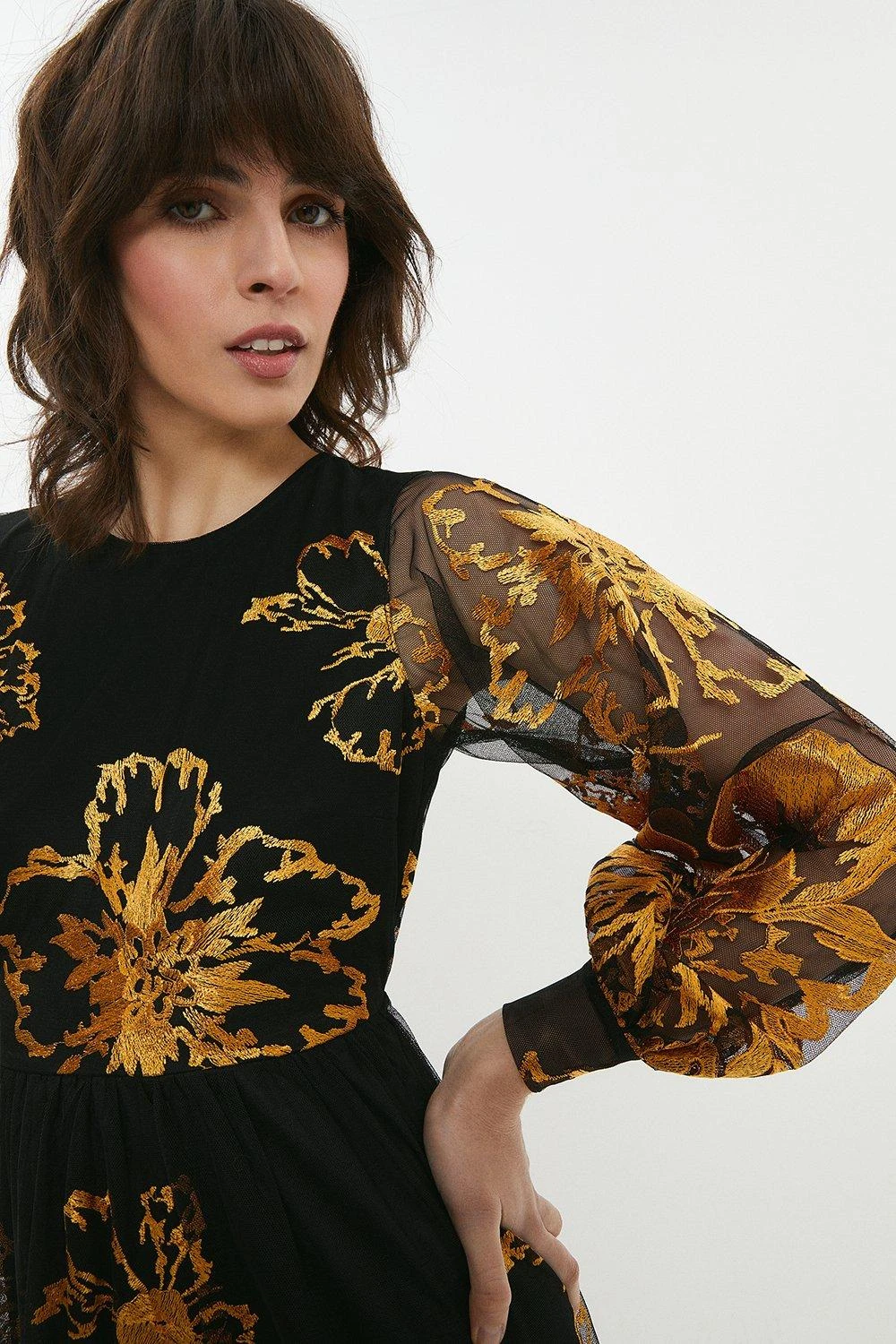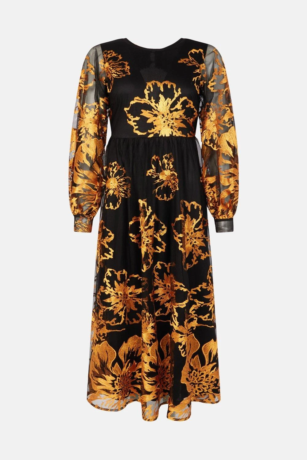 Gold foil flowers add instant regal opulence to this arresting midi dress. Made to wow at special soirees, it features puffed, semi-sheer sleeves, an open back and lacy edging for even more textural allure.