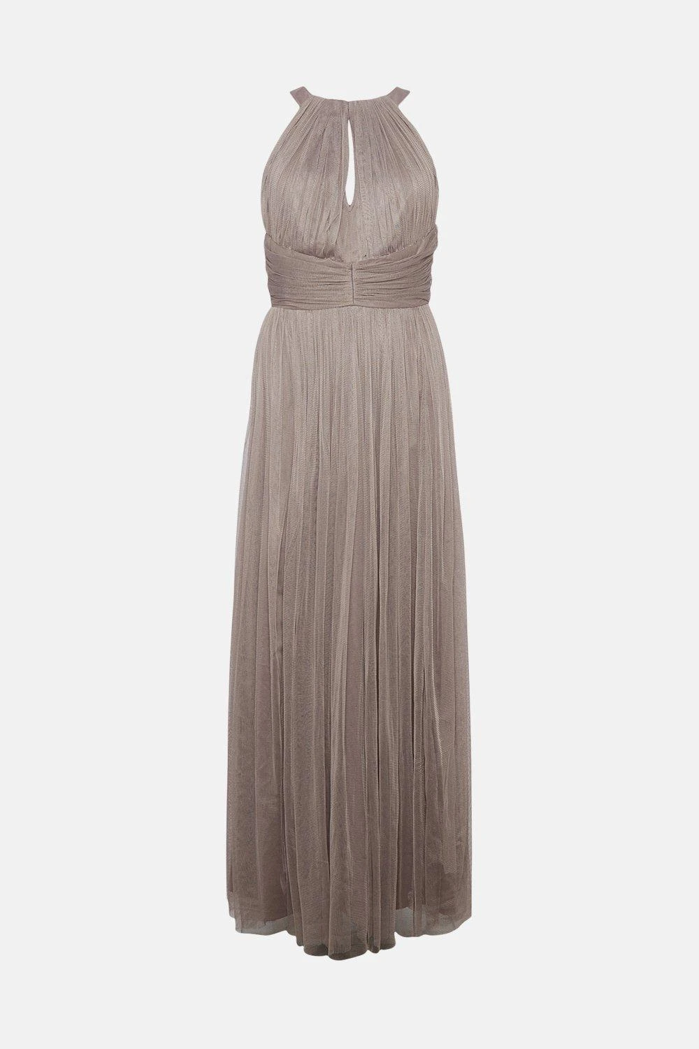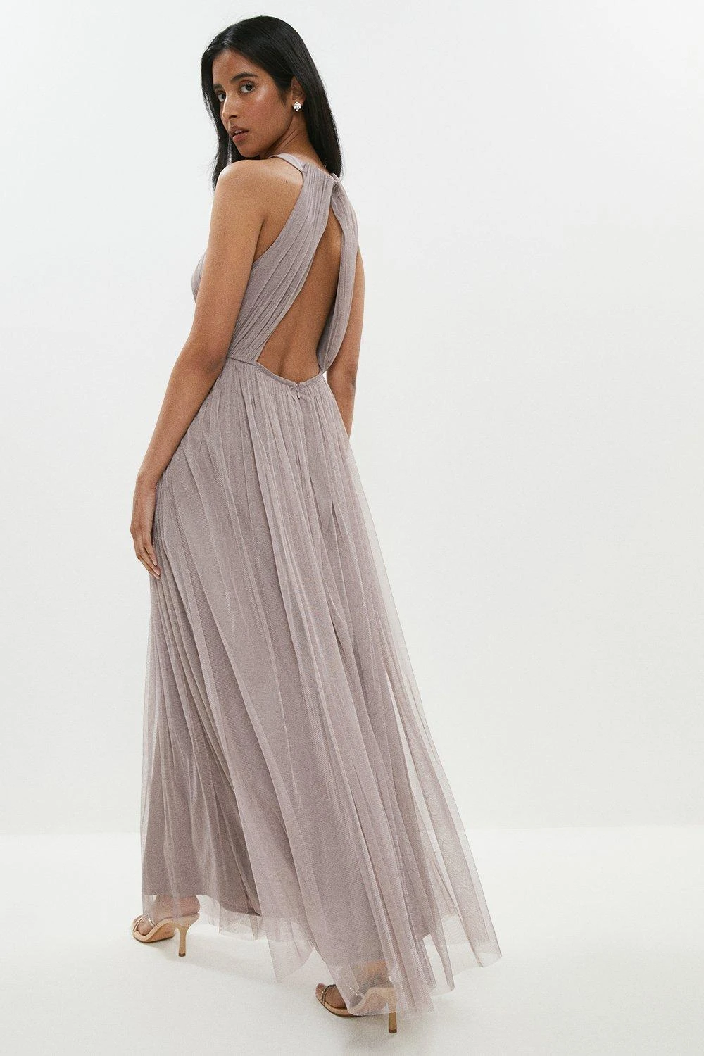 A gorgeous choice for your bridesmaid look, this flowing tulle maxi dress sweeps elegantly up the aisle and features a feminine halter neckline, front cutout and fitted waistband to cinch in your silhouette. The open back looks beautifully romantic as you sweep past wedding guests.
