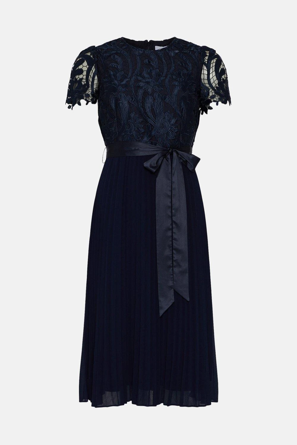 The epitome of ladylike elegance, this charming midi dress is defined by its luxe lace bodice, swishy pleats and feminine satin bow belt.