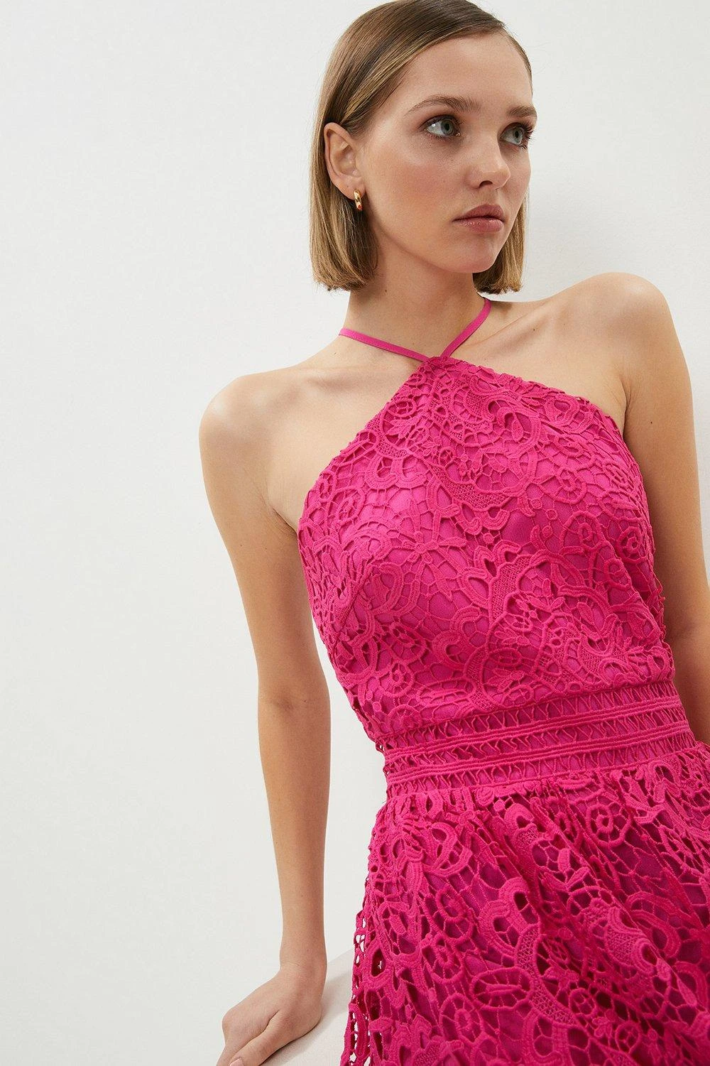 Look pretty in pink – hot pink, that is. This gorgeous lace dress features a feminine halter neckline and swishy, scalloped skirt made for dancing the night away in.