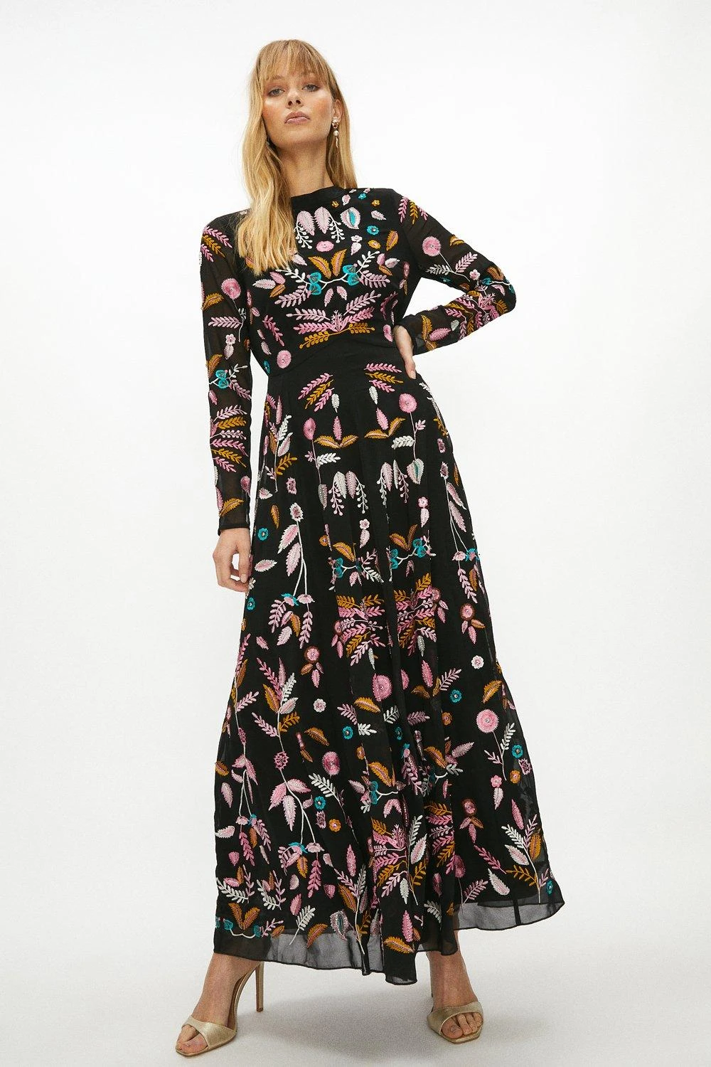 Framed by a contemporary cut-out back, this maxi dress flows with languid elegance – hosting an inspired cacophony of bright and beautiful floral embroidery. Balancing a round neckline with long sleeves, it defines the waist before flowing into an A-line skirt that lands at a graceful full length. Pair this captivating piece with contrasting stilettos for a vibrant ensemble that blooms with confidence.