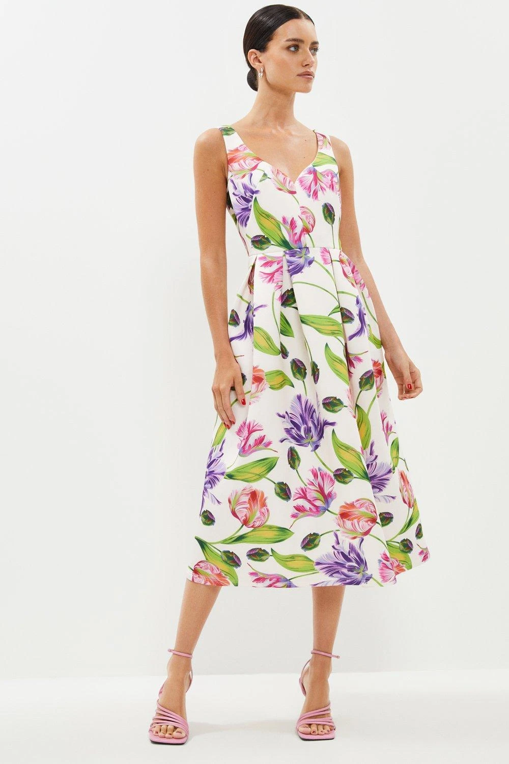 Blooming with artful abstract florals, this buoyant number is soon to be the belle of your occasionwear treasure trove. Vibrant botanicals flourish across the fit-and-flare silhouette, formed by a V-neckline and scooped back. Defining the waist with a fitted cut, it flows into a cascading A-line skirt. Offset the colour palette of this piece with zesty accessories that demand attention.