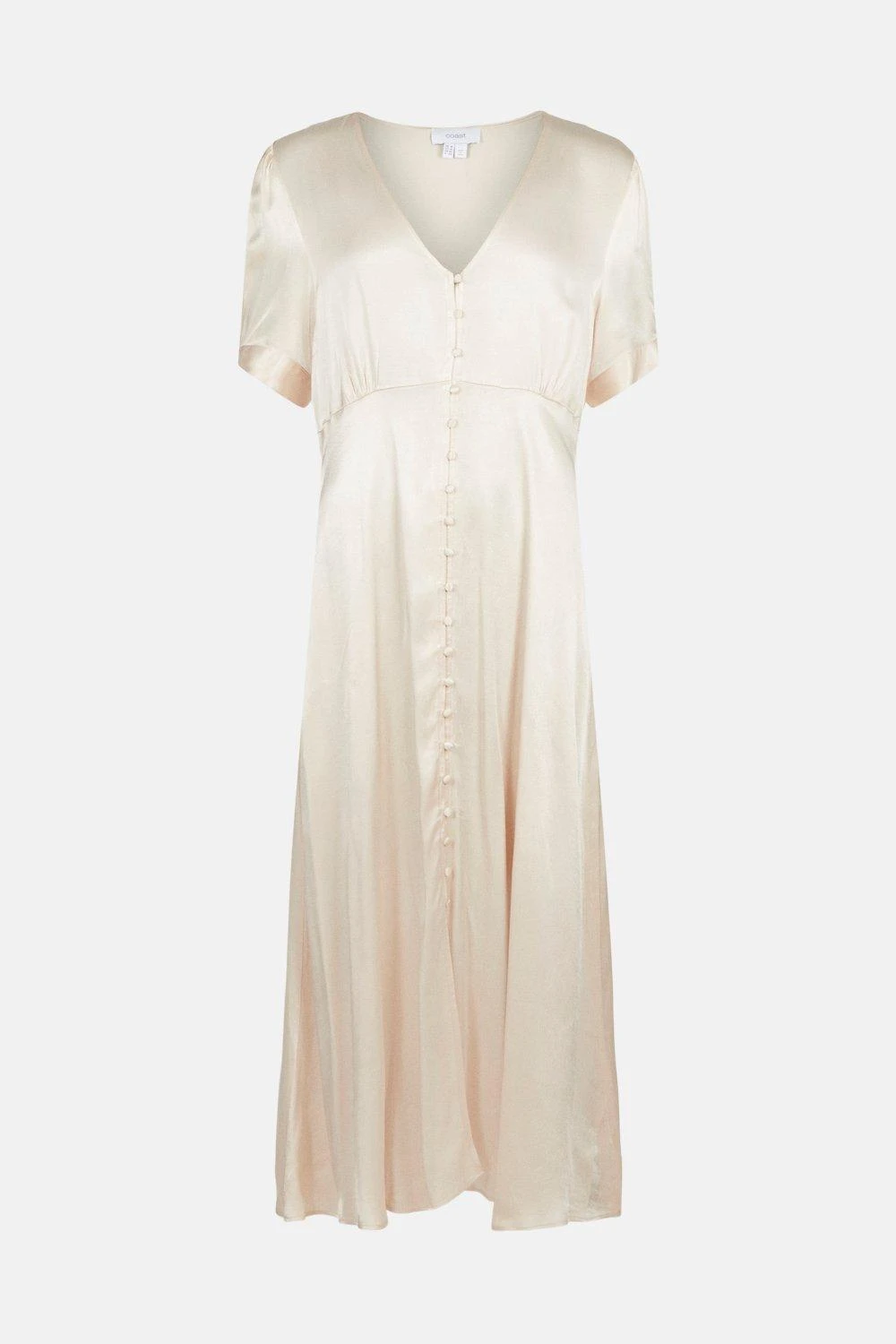 Dress perfection, this satin maxi dress is a love-forever piece. Beautifully take in the flowing skirt, front split, dainty row of buttons and slightly puffed sleeves with cuffs and a button.