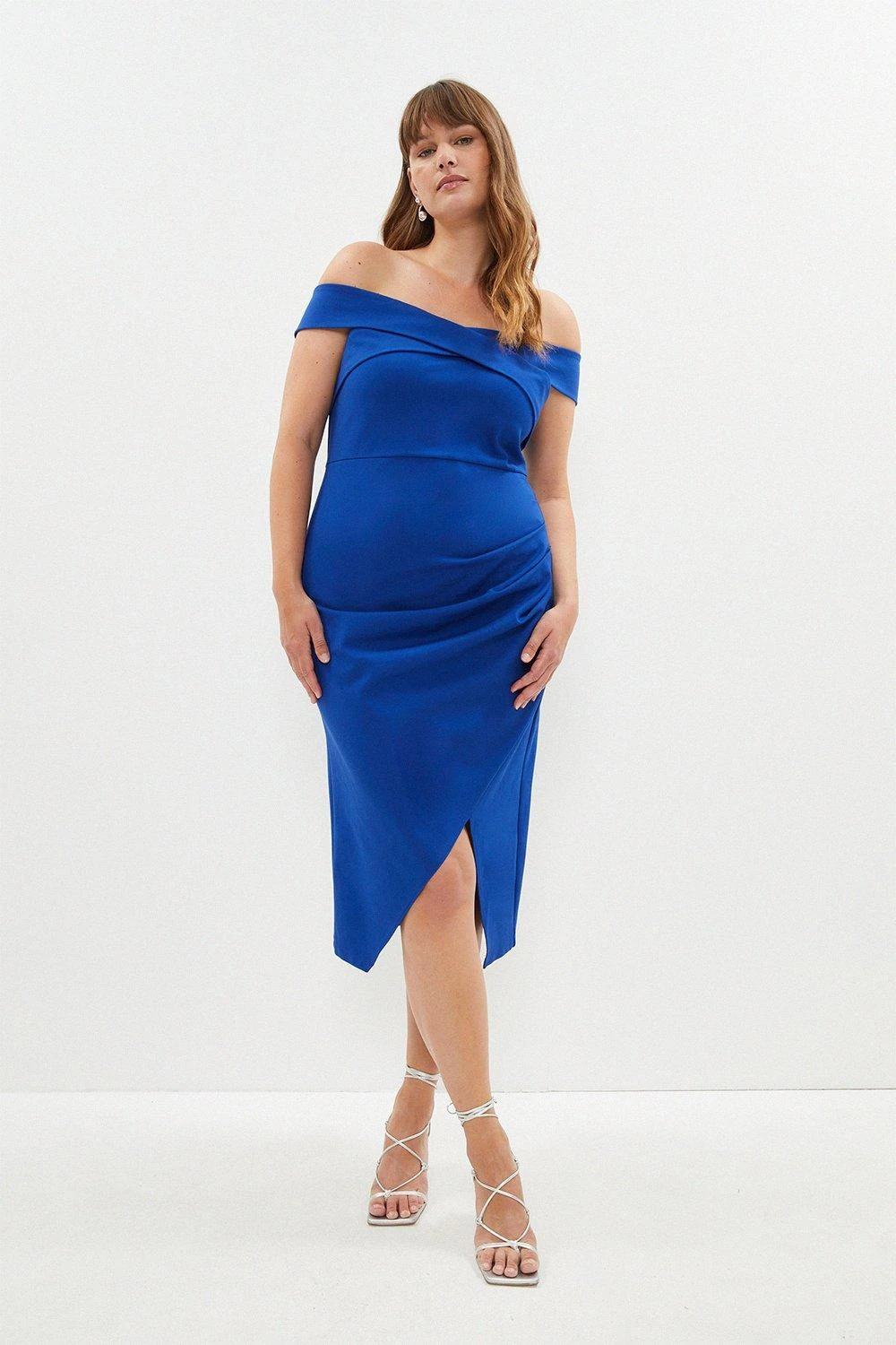 Channel the glamour of an Old Hollywood icon in this serenely beautiful Bardot dress. Crafted from softly structured fabric, it looks as good as it feels, featuring a crossover, off-shoulder neckline, ruched detailing and a demure pencil skirt.