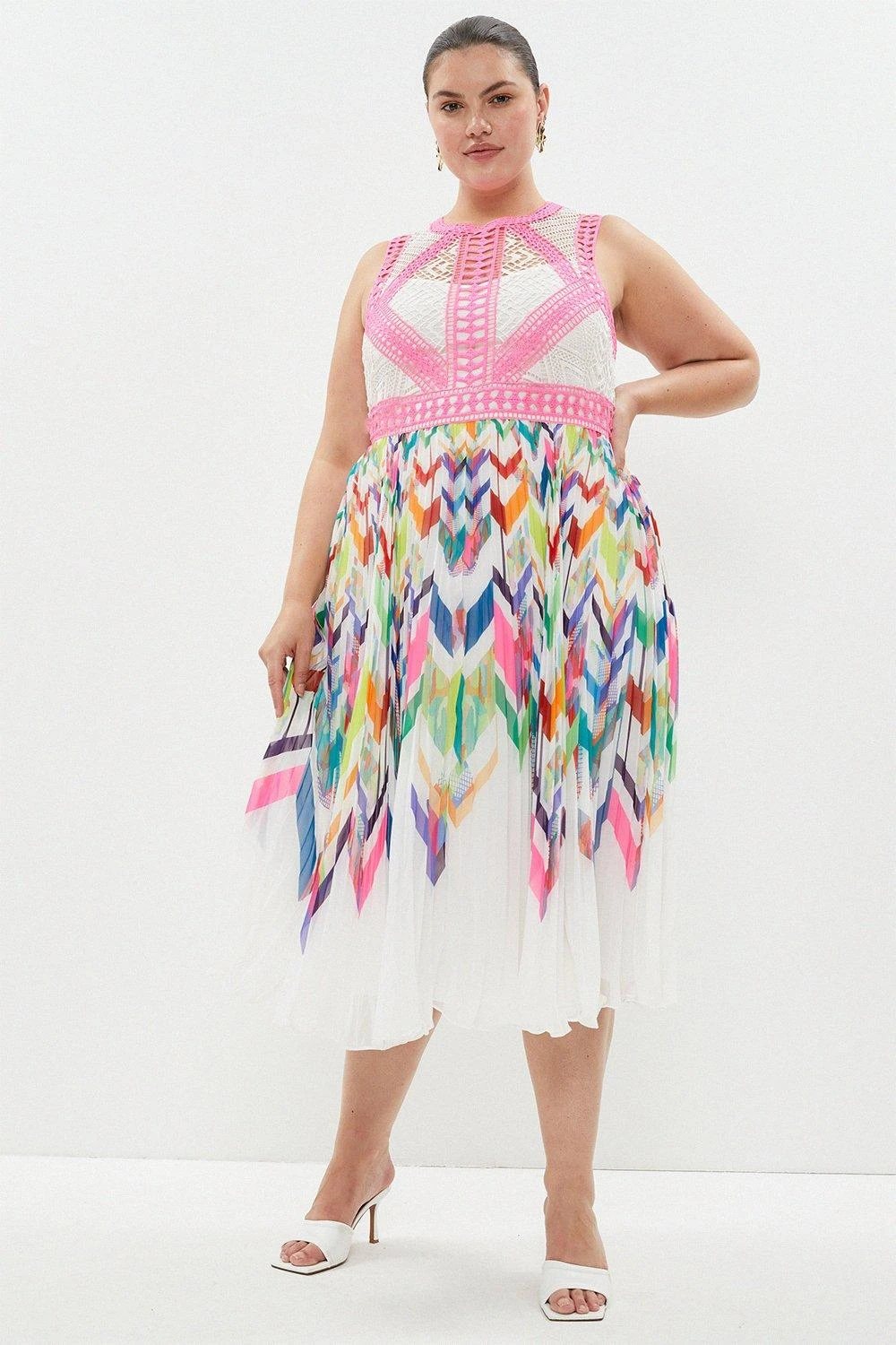 Marrying a lacy bodice with printed pleats, this extra-special dress from our collaboration with the talented Nick Grindrod is certain to garner admiring glances. Its colourful chevrons offset contrast lace panelling and a sleeveless cut – take advantage of the skirt’s swishiness with sky-high colour-pop heels.