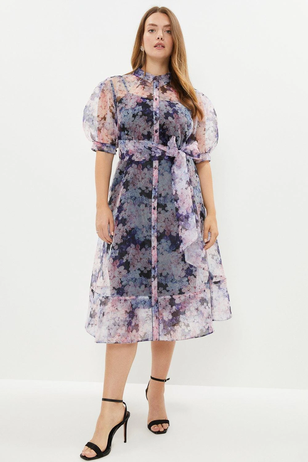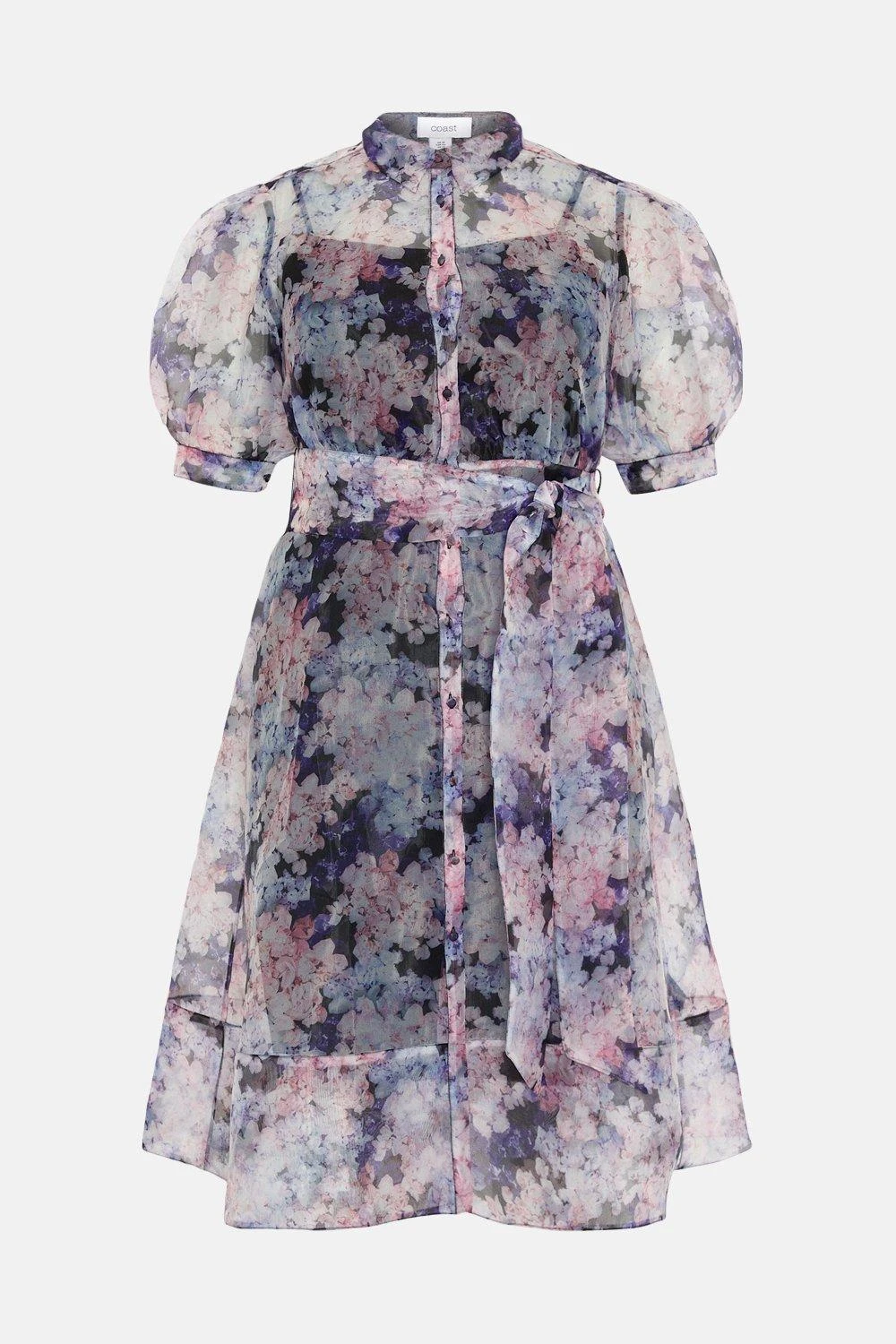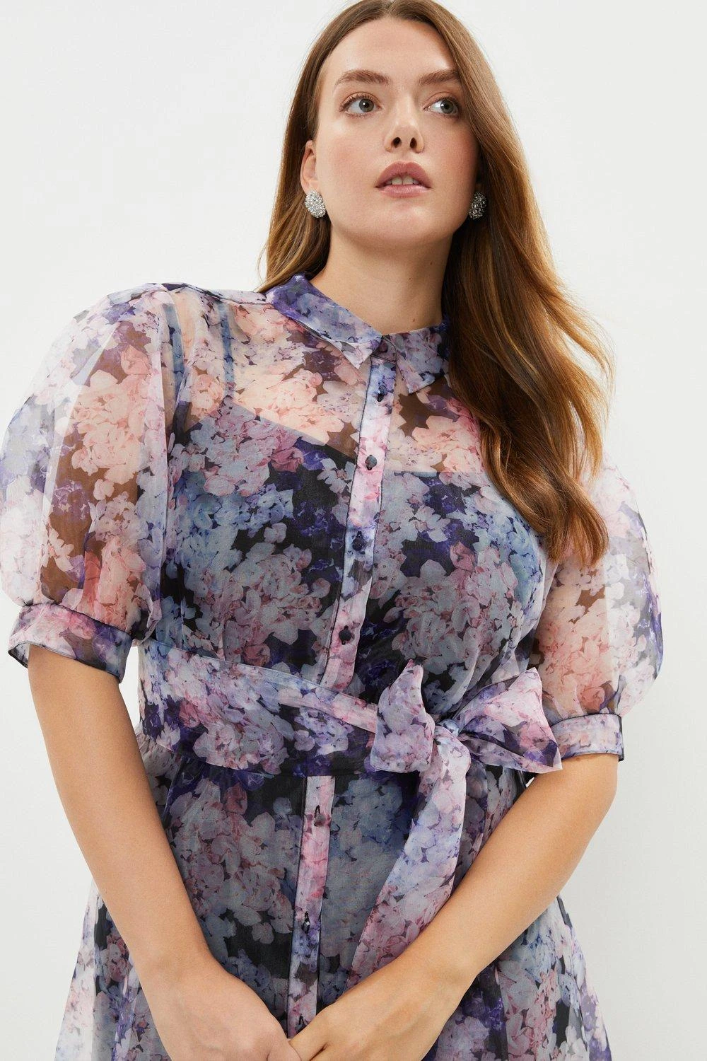 Flamboyance with a dash of femininity. This opulent organza shirt dress does it all, blending puffed sleeves with a gauzy floral-print overlay, belt tie and pointed collar. It buttons up at the front, further adding to its polished-but-preppy appeal.