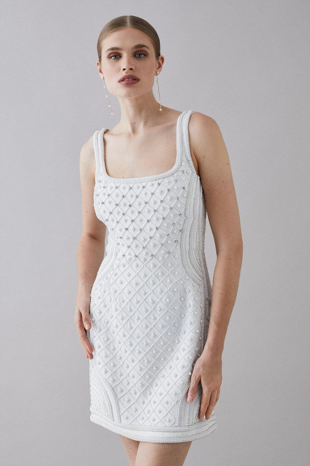 Part of the Sophie Habboo x Coast collection. Embracing an art-deco aesthetic, this mini dress echoes Sophie’s penchant for elevated simplicity. Featuring a figure-skimming silhouette with a square neckline, this design is swathed in intricate geo embroidery.