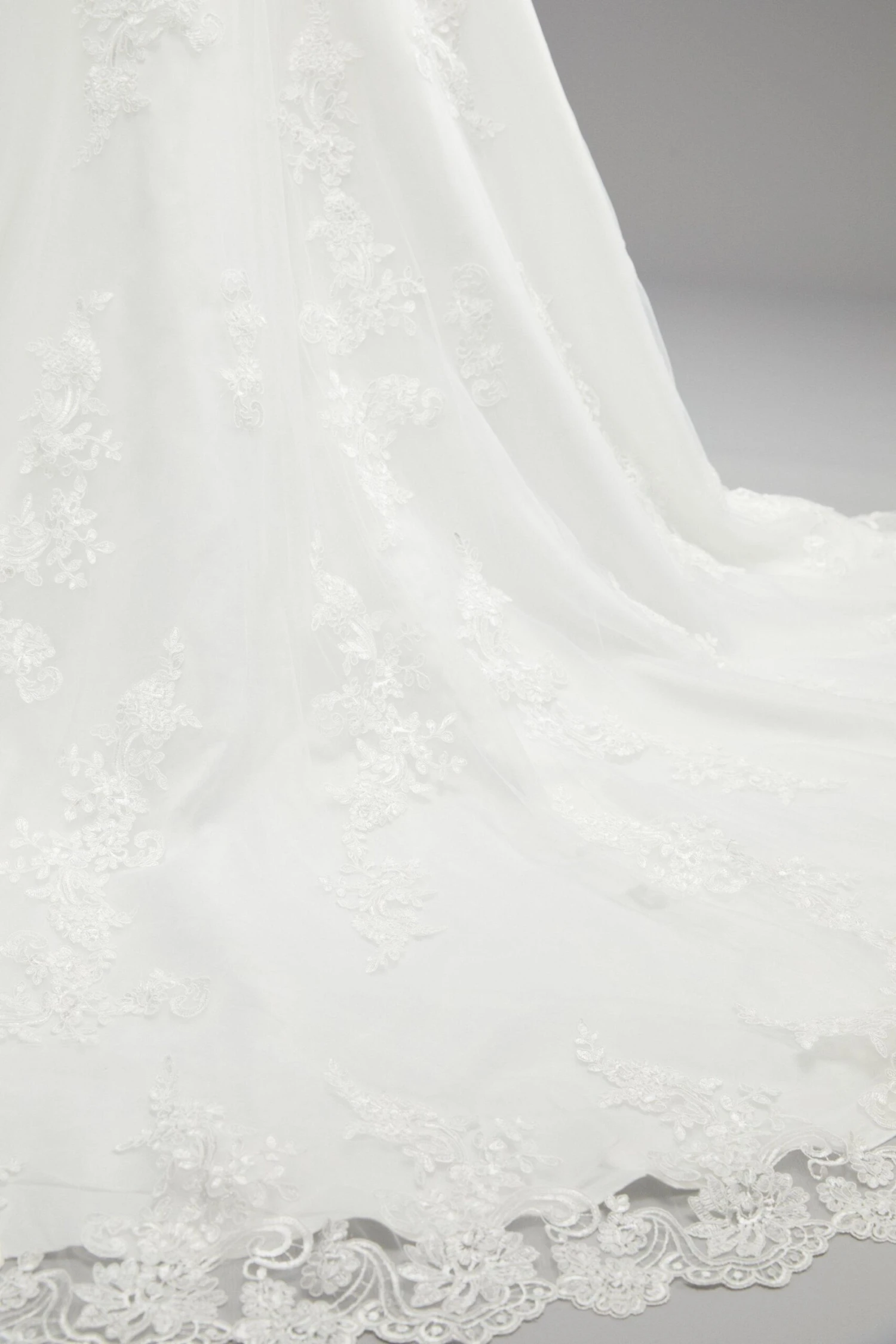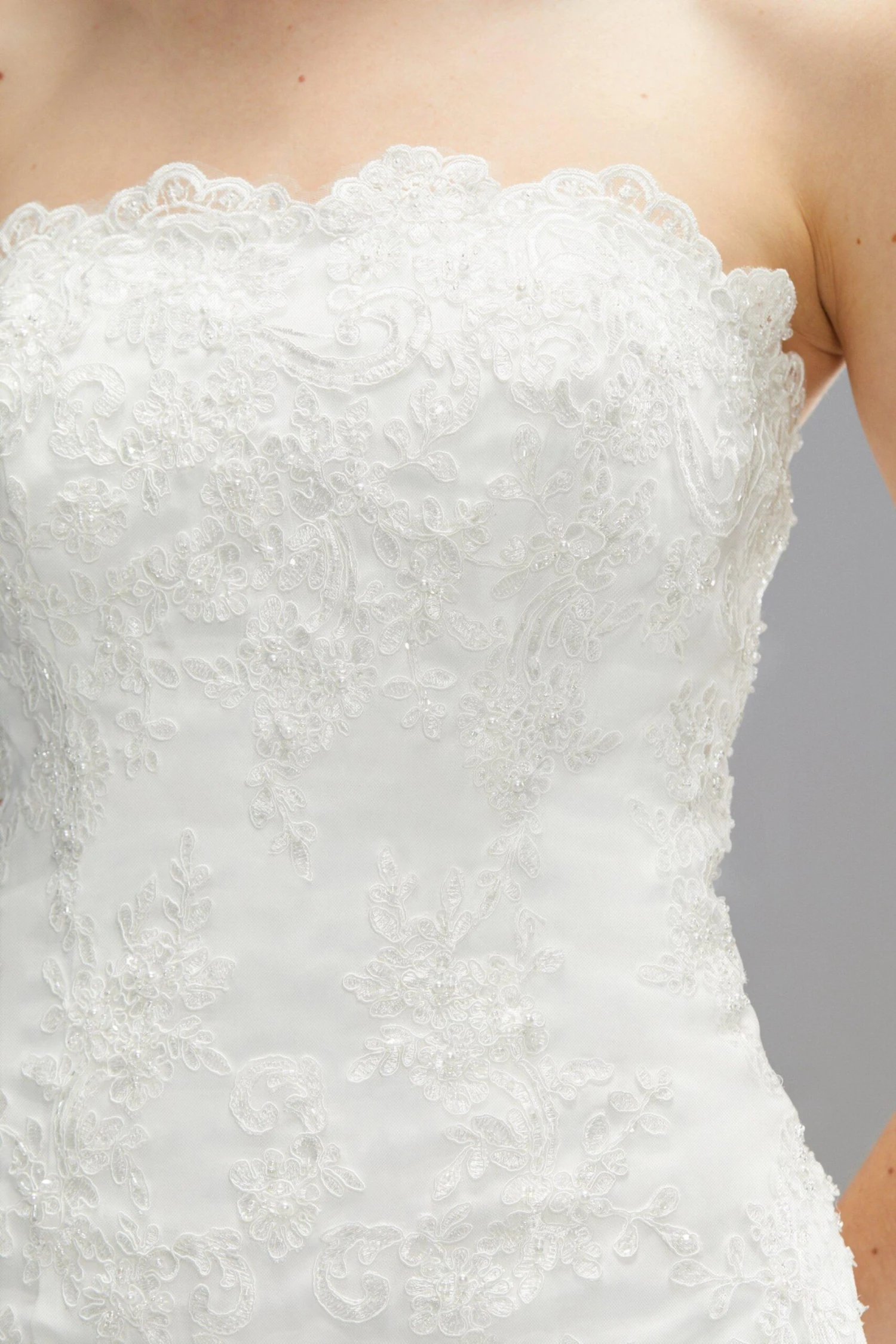 This showstopping gown marks the first step to make your big day the perfect celebration of enduring love. Meticulously crafted from embellished lace with boning at the bodice to ensure a sculpted fit, this idyllic design is finished with an ultra-feminine, curve-hugging, fishtail skirt worthy of fairytales.