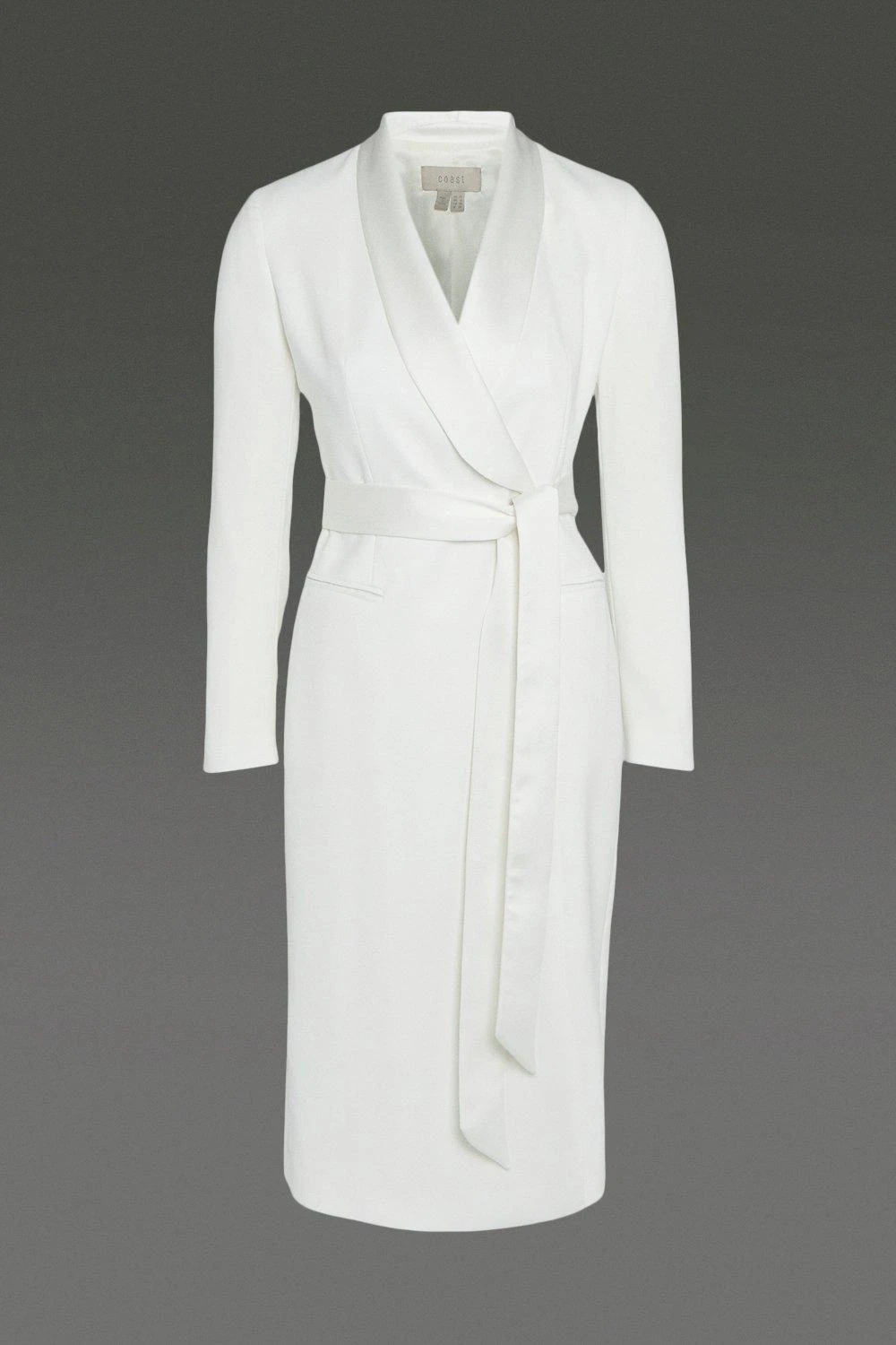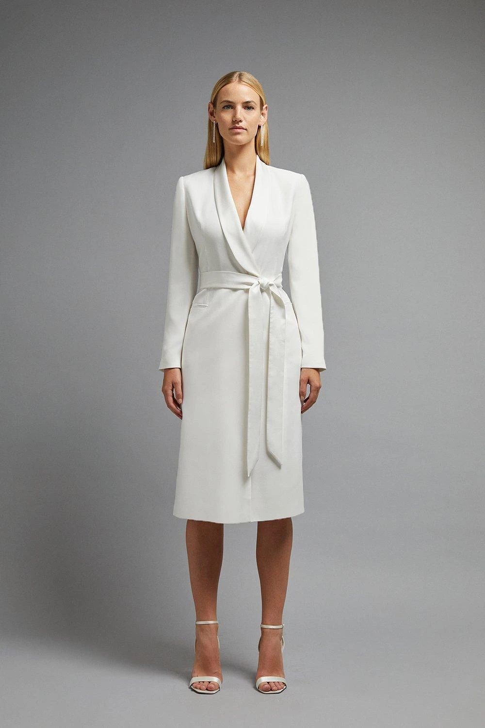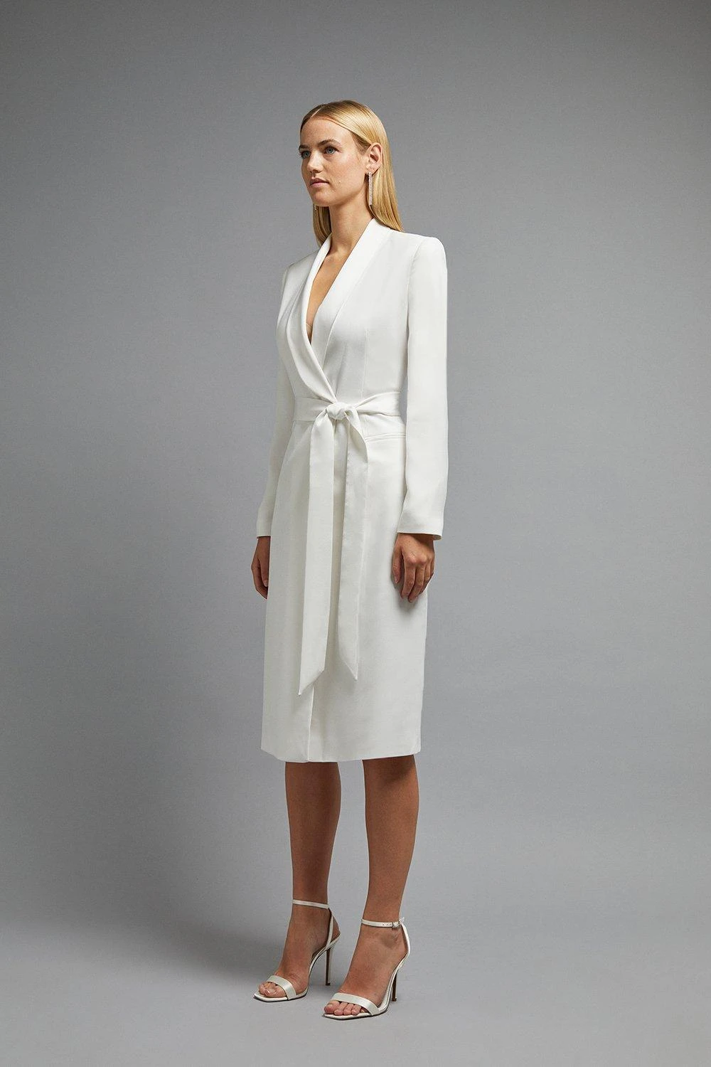 Who needs a big wedding dress? Look to this bridal dress for something different on your special day! Ultra-elegant and ultra-fitted, the piece beautifully wraps around your figure with its classic tux design. Tying at the waist using a pretty bow detail, you’ll be the most stylish bride ever.