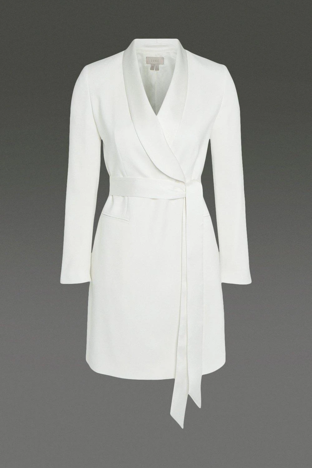Made for modern brides, this tailored playsuit blends a traditional ivory hue with an ultra-contemporary silhouette. With its wrap-over front, tie belt and pressed shorts, this blazer-inspired design looks oh-so-elegant teamed with minimal pearl earrings and strappy heels. A directional – but still dazzling – choice for your big day.