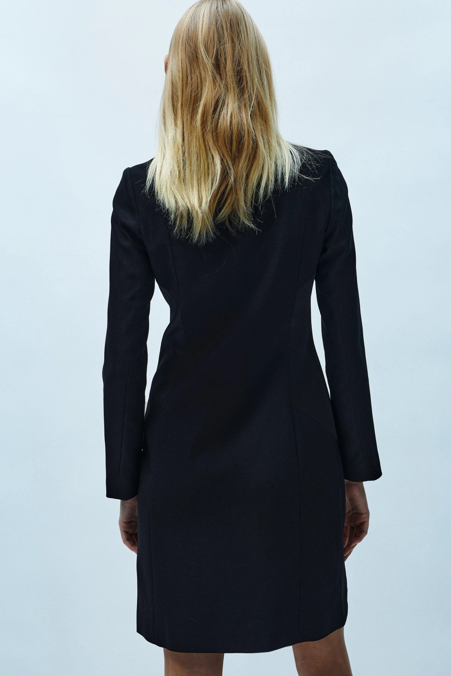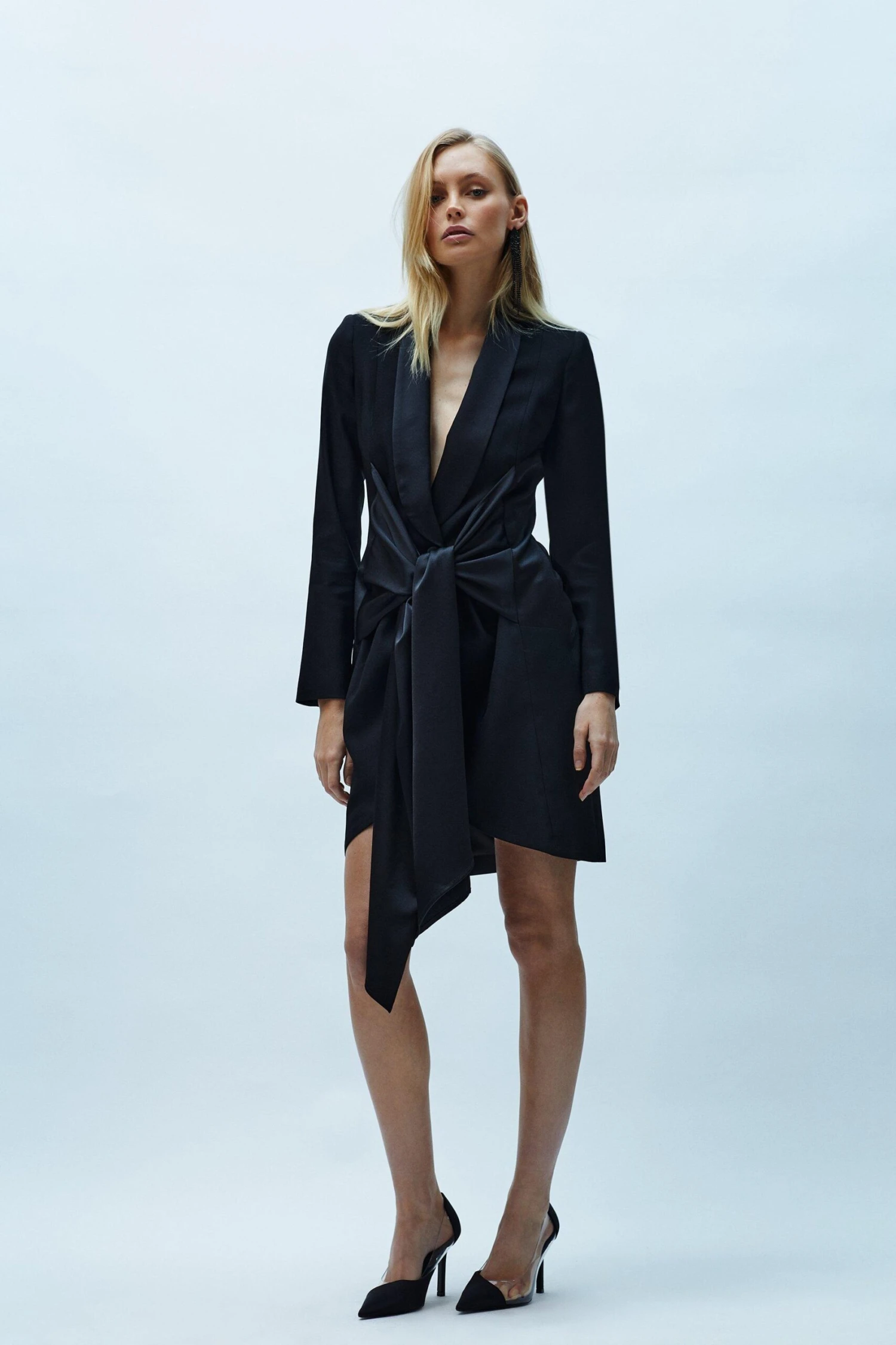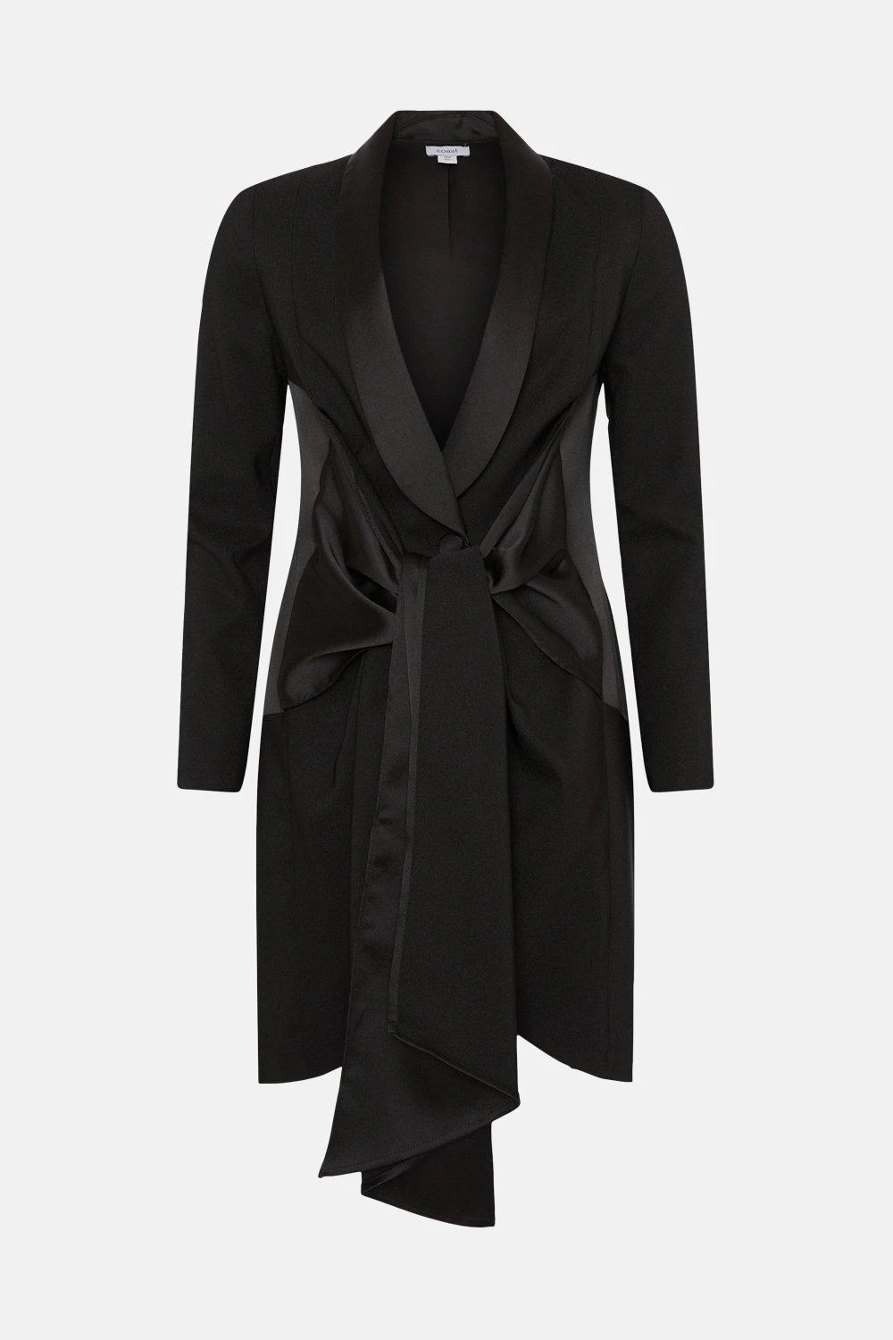 The perfect companion to evening plans, this blazer dress exudes elegance. A tie front detail creates a flattering draped effect, while shawl lapels add an element of sophistication.