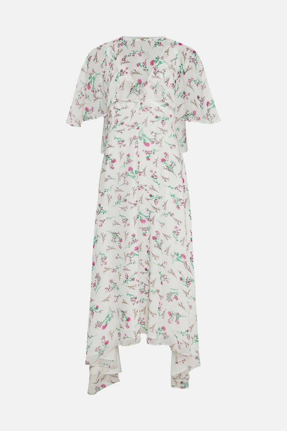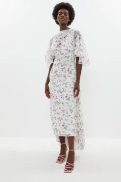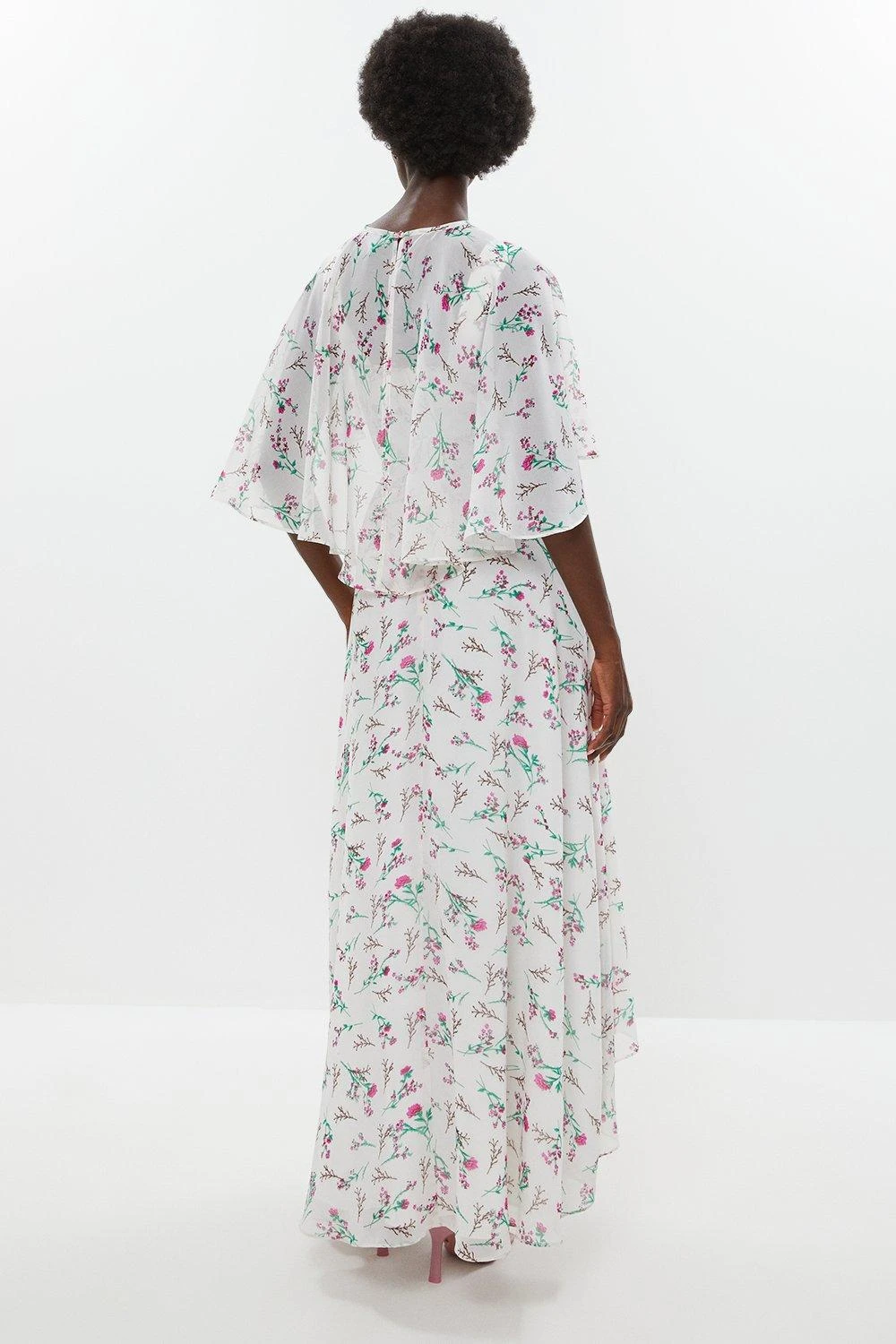 Indulge your ethereal side on specials days. This exceptionally elegant maxi dress features a V-neck bodice and dramatic asymmetric skirt, accented with a flowing semi-sheer cape complete with fluttery sleeves. Worn alone or with the gauzy cape, the ladylike floral print looks gorgeous styled with tousled hair and strappy stilettos.