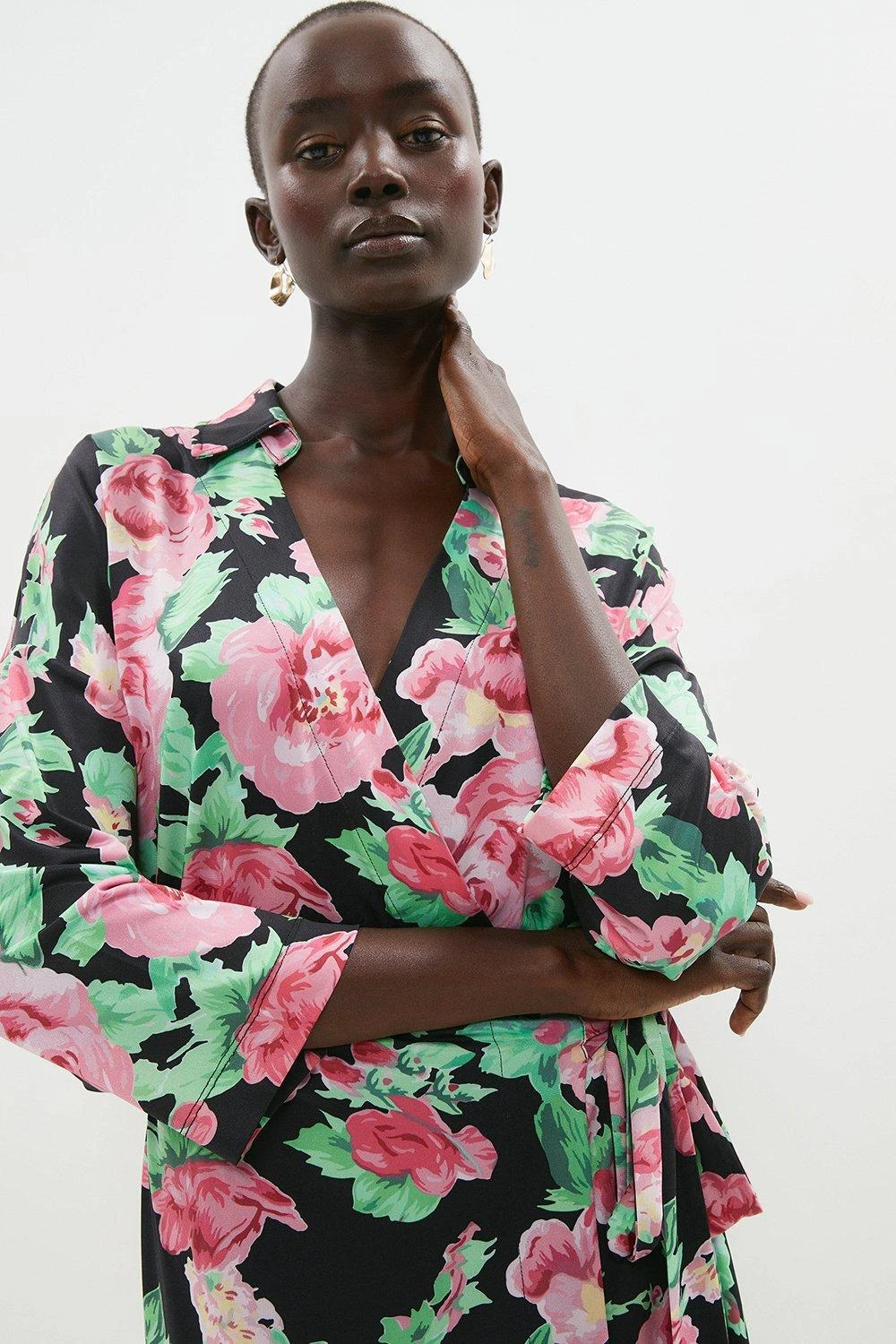 Your gateway to brunchtobar style, this vibrantly printed midi dress shows off a feminine wrap front, threequarter sleeves and a waistcinching belt. Pick out neutral tones from the vivid print with matching black accessories.