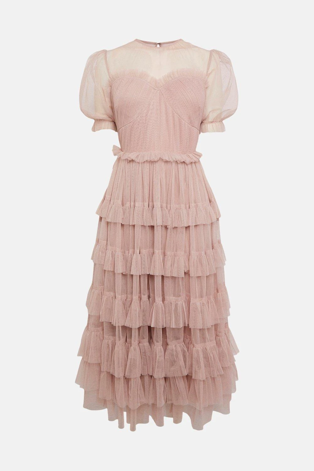 Made for your very own moment in the spotlight, this dreamy tulle confection combines frothy tiers with romantic puffed sleeves and a shirred, sweetheart bodice. Enhance the breathtakingly beautiful silhouette with metallic heels and dramatic drop earrings for a party look to remember.