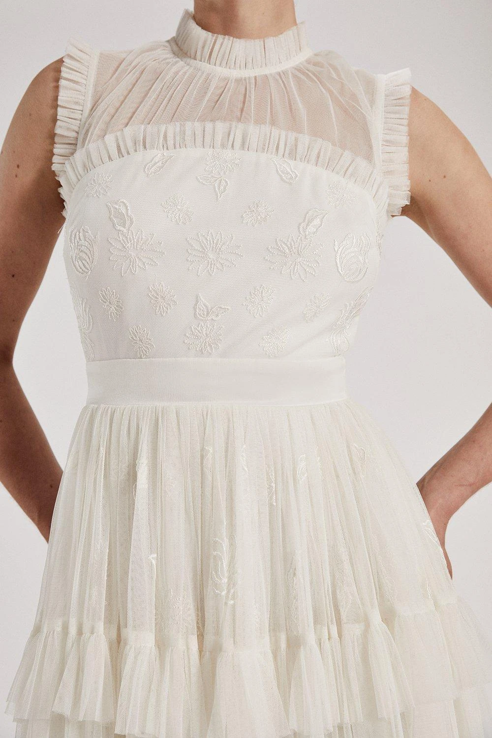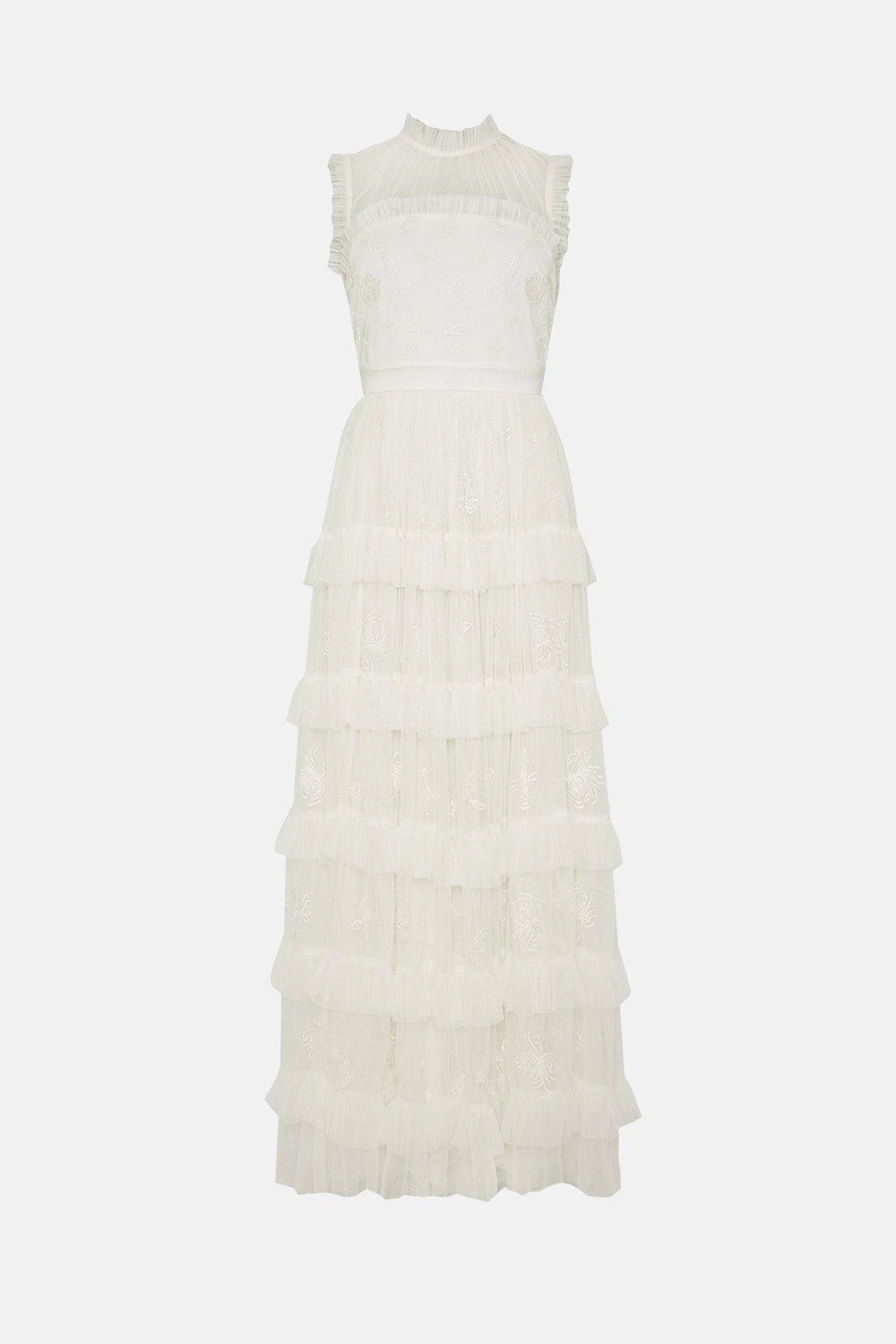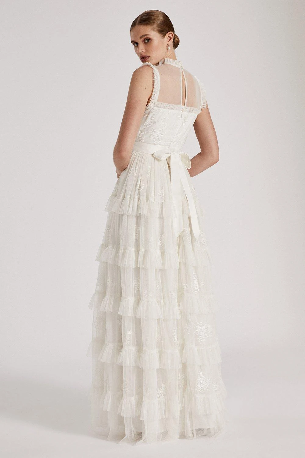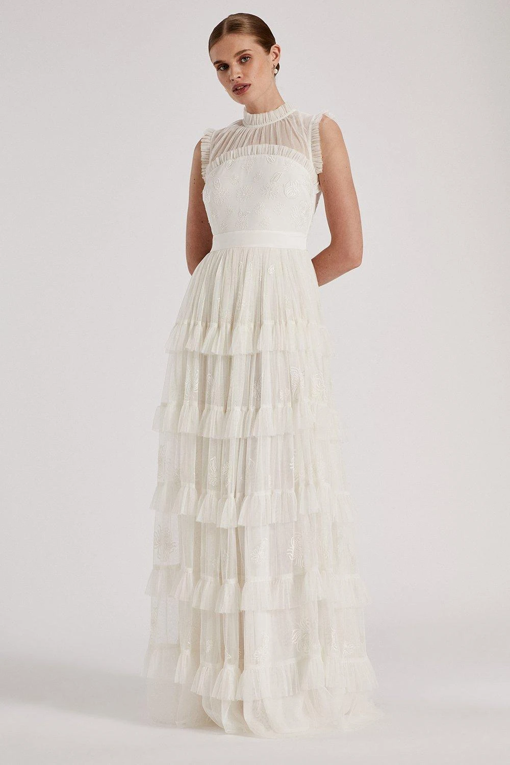 Part of The Royal School of Needlework x Coast collection. A floor length gown with cascading ruffle tiers come together on a delicately embroidered bodice for an elegantly feminine dress. Inspired by the Kyoto artwork, this is a contemporary design for the modern bride. ​