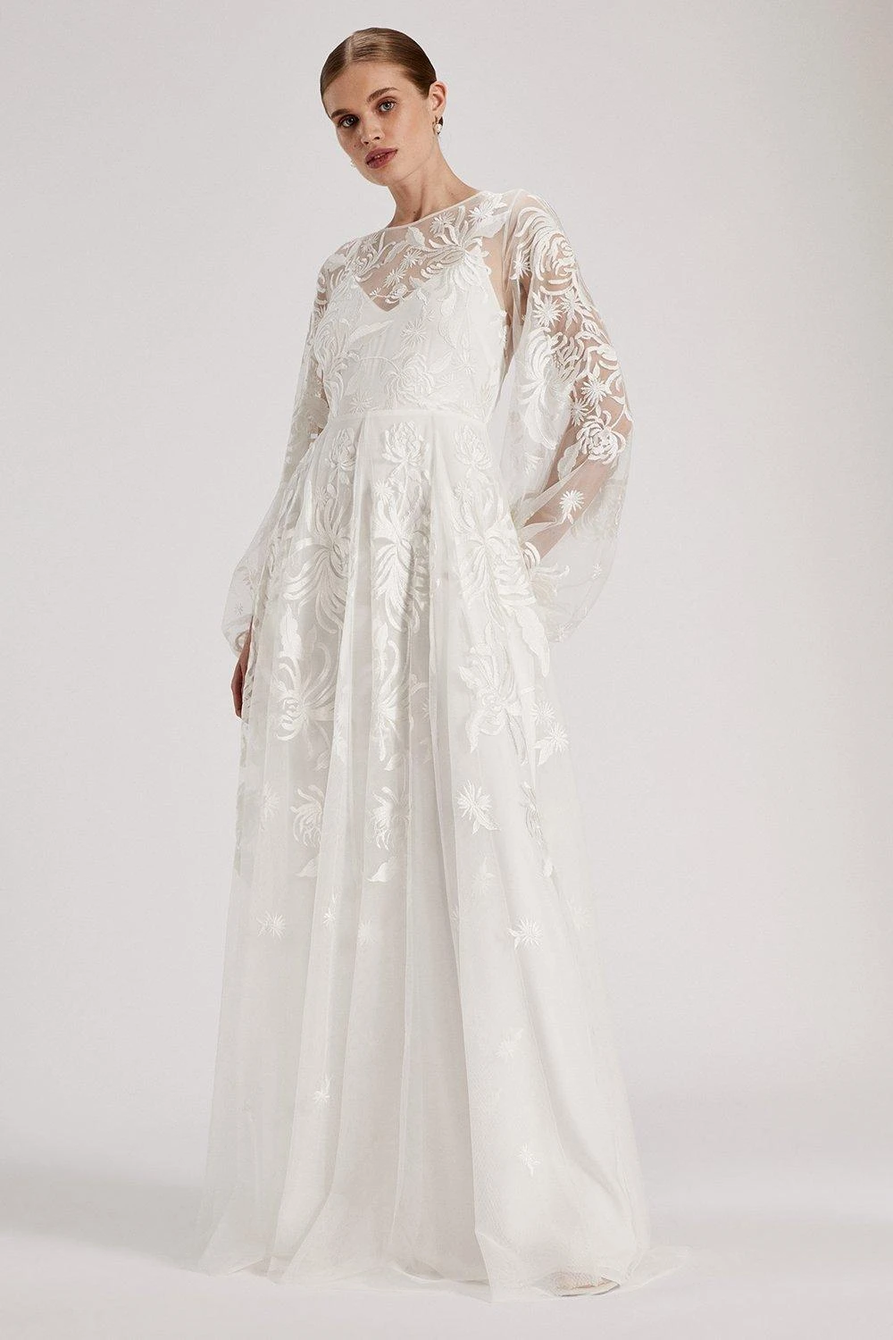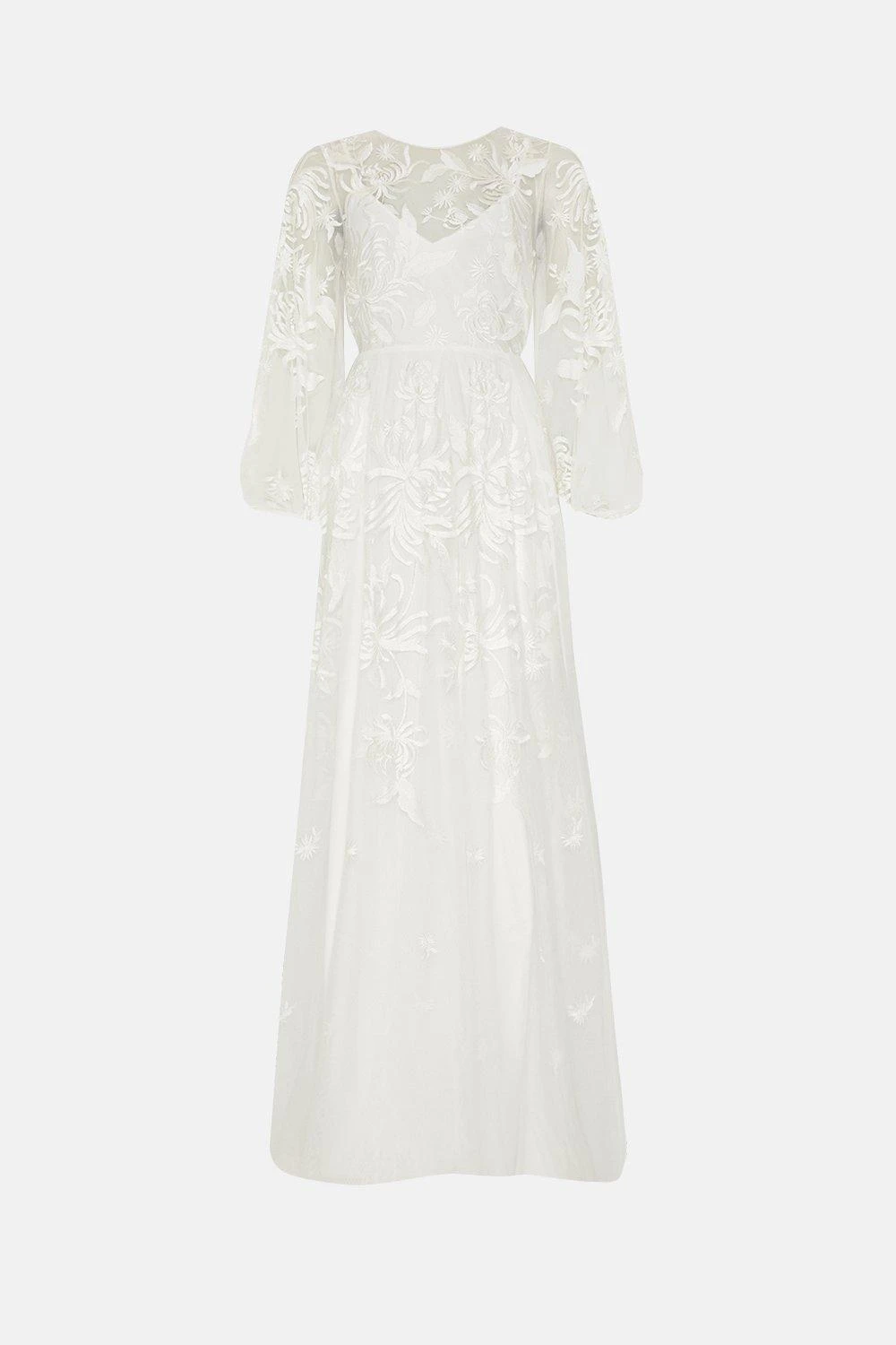 Part of The Royal School of Needlework x Coast collection. A gown inspired by the artwork of the Kyoto piece, this floor-sweeping dress is both mesmerising and subtle. Adorned with floral applique and detailed embroidery, cut with balloon sleeves and flattering silhouette. ​
