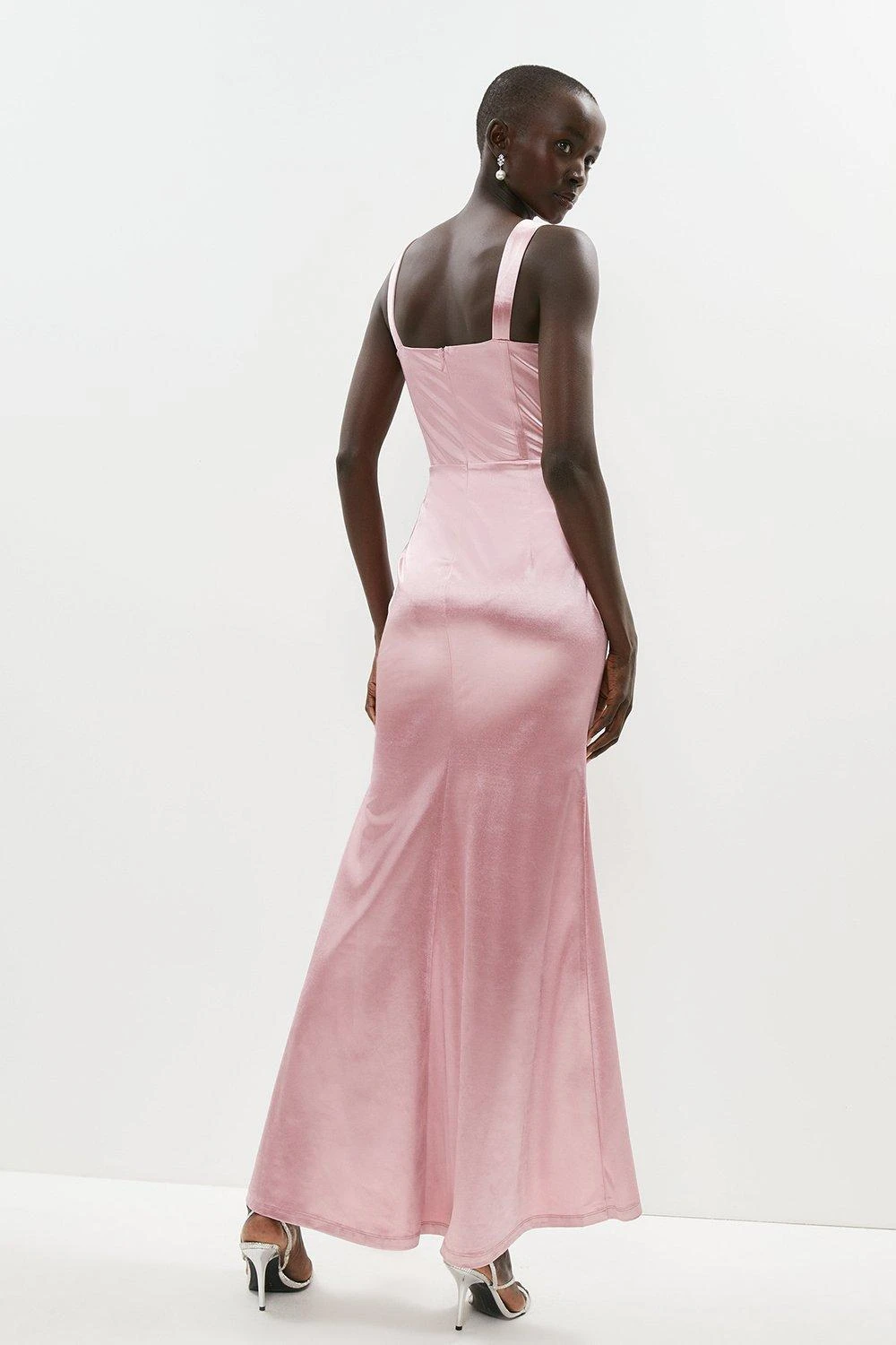 A true after-dark stunner, this rose-pink maxi dress combines a structured corset-style bodice with a liquid-like fishtail skirt. Nodding to the hedonistic ‘80s era, it brings instant drama to special occasions.
