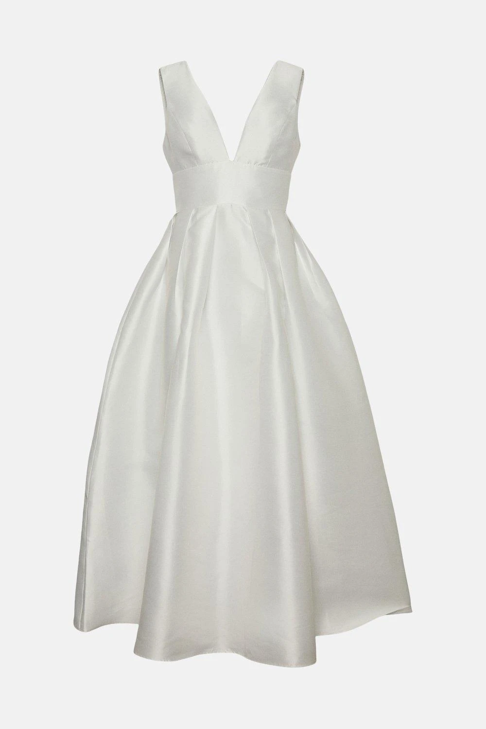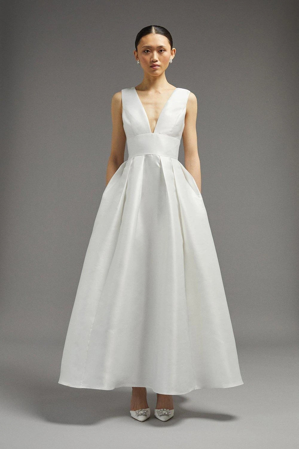 An Audrey Hepburn-inspired design that’s perfect for your big day. This clean-lined satin maxi dress skims the form thanks to its plunging V-neck bodice and wide, full skirt. Simple in its sophistication, it was made for modern minimalists – just add show-stopping heels and a swept-back chignon.
