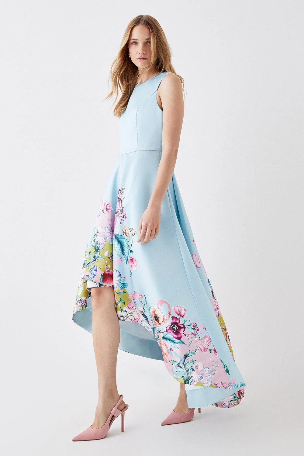 Textures of smooth satin meet exuberant floral bouquets for an irresistibly delicate occasion dress. Topped by a modest round neck and signed off by an elegant, dipped hem skirt, this style is perfect if you want to show off an stunning pair of shoes too.