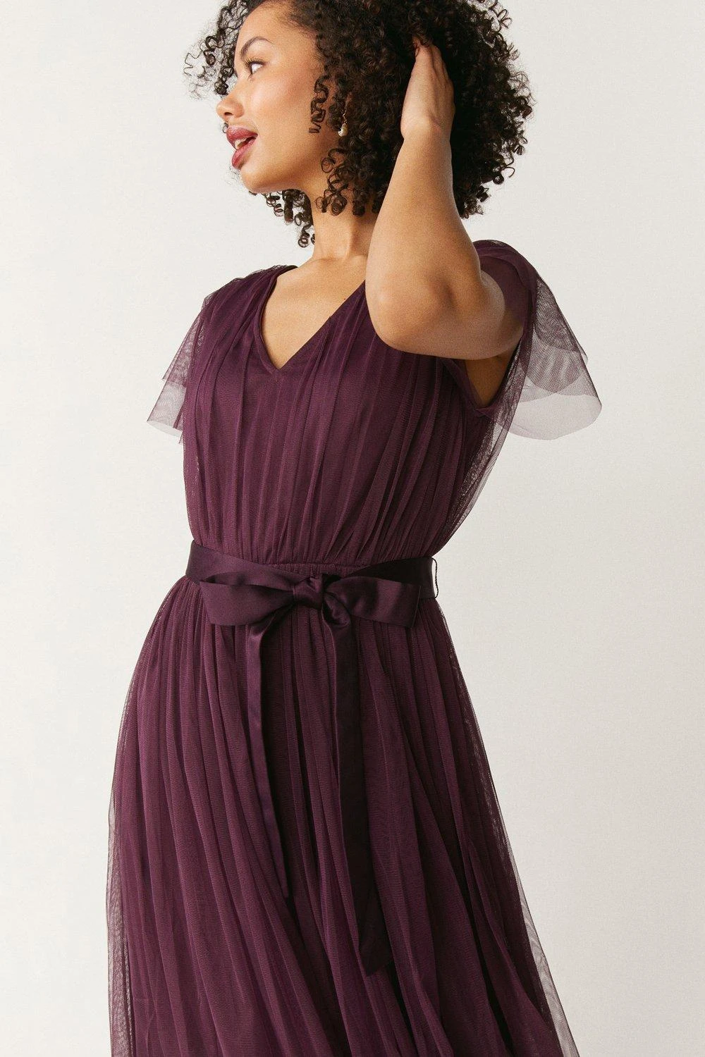 Beautiful for bridesmaid duties or any number of stylish soirees, look the part in layers of luxurious tulle. Rich in fairytale charm, this tie-belt maxi dress flows down in frothy splendour and features a flattering V-neck and semi-sheer sleeves.