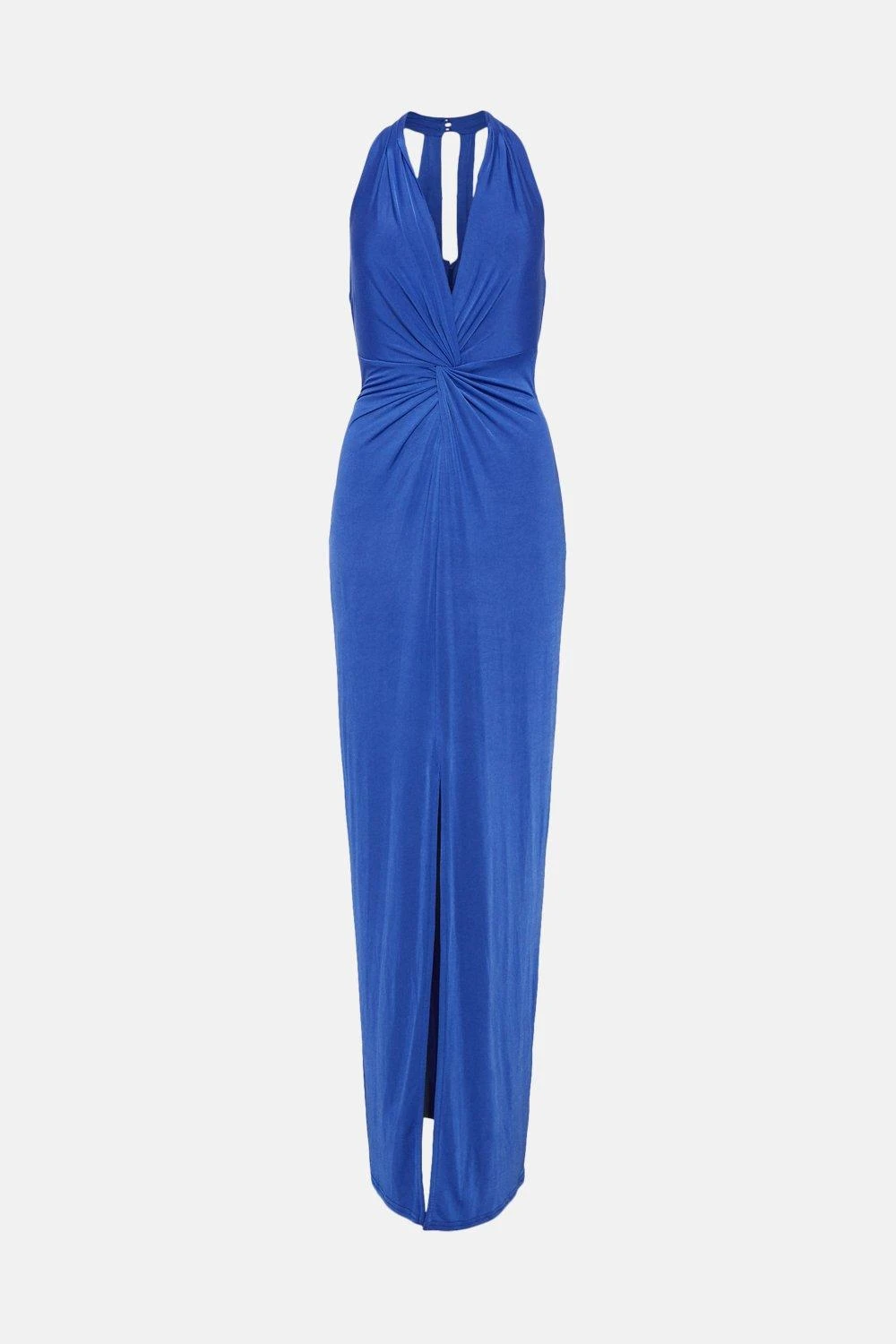 Prepare to captivate the crowd in this dramatic cobalt-blue maxi dress. Detailed with a textured front twist and leg-revealing hem split, this beautiful halter-neck number makes a seductive choice for your next special soiree.